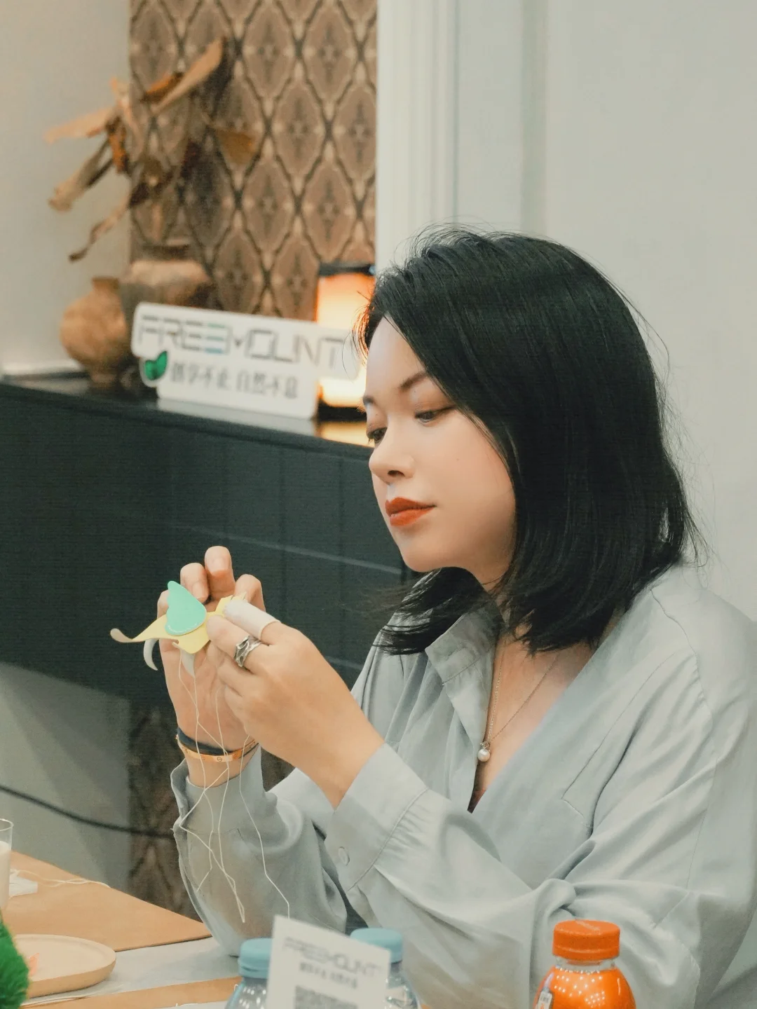 🍀主办方FREEMOUNT®作为全球可持续新材料品牌,以“低碳、健康、清洁”为理念,涵盖生物基、回收再循环等类别,传递可持续生活方式,引领产业链绿色发展。活动现场主办方代表也分享了关于FREEMOUNT®的理念和环保皮的一些基础知识,原来现在超纤皮技术已经快进到100%零溶剂的“全水性”啦,这次工坊使用的边角料就是这种独特工艺生产出来的REGEN瑞芝锦超纤皮,它在生产的每个环节,都能减少对水源和土壤的负担👍
