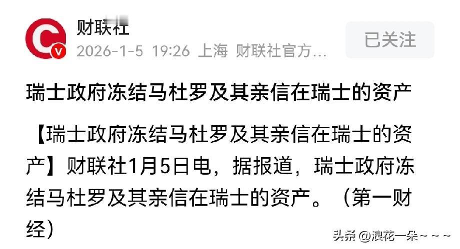后续! 就在刚刚,我看瑞士🇨🇭脸都不要了? 据可靠消息,瑞士政府冻结马杜罗及其亲信在瑞士的资产! 在我看来,这事可大可小,往大了说,这是配合美国侵略委内瑞拉的后续操作,是在配合美国向全世界立威,不听美国的话,谁得罪了美国,你们在瑞士的财产我就要冻结? 往小了说,这是一个国家在欺负一个家族或个人,这跟抢劫没什么两样! 当然瑞士这一波跪舔操作,我认为也会给瑞士的信用带来一些影响,像类似的事情,他可能也不是这一次了,所以说,像这样的国家不可信,去瑞士存款要小心了。