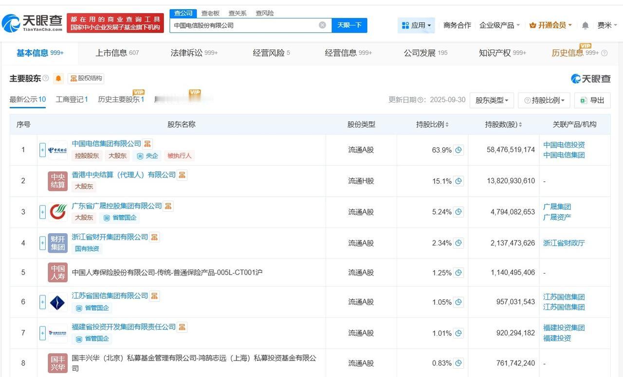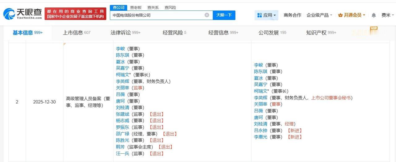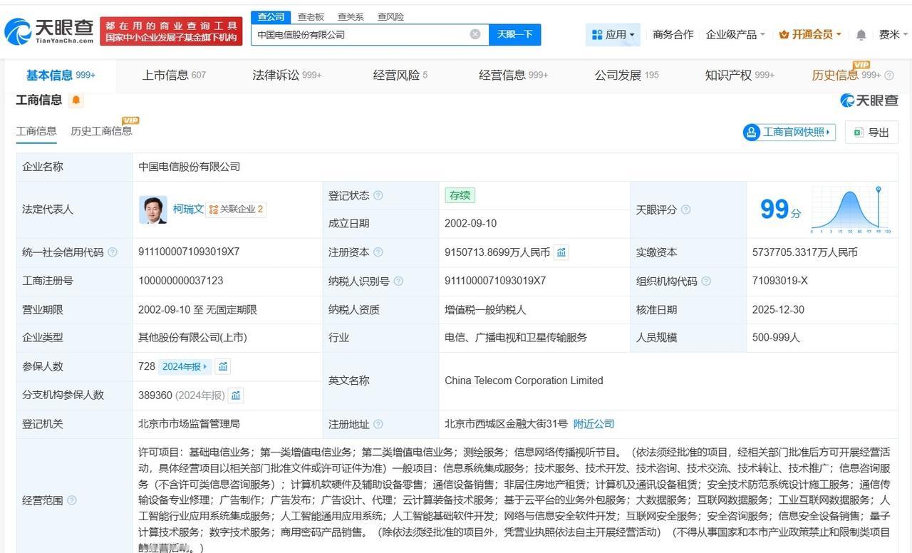 中国电信经营范围新增多项AI业务 天眼查工商信息显示,近日,中国电信发生工商变更,经营范围新增人工智能行业应用系统集成服务、人工智能通用应用系统、人工智能基础软件开发等,同时多位主要人员发生变更。 中国电信股份有限公司成立于2002年9月,法定代表人为柯瑞文,注册资本约915亿人民币。股东信息显示,该公司由中国电信集团有限公司、香港中央结算(代理人)有限公司、广东省广晟控股集团有限公司等共同持股。 天眼查信息: