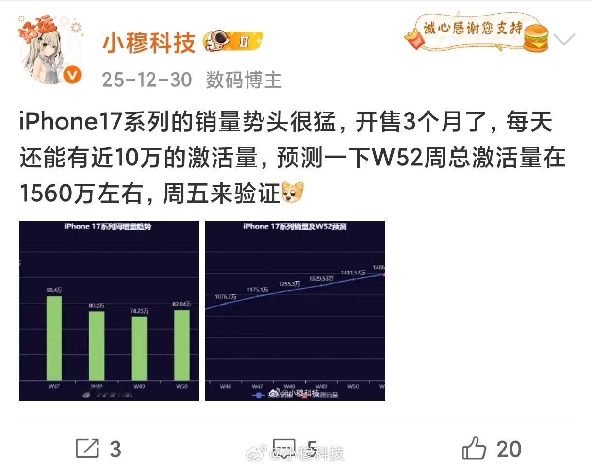 截止W52周,不知名第三方数据,iPhone17系列国内市场激活量大概1557万,和我预测1560万大差不差2025年突破1600万已经板上钉钉了,iPhone17系列后劲依然很足,太不可思议了iPhone17系列销量破1600万