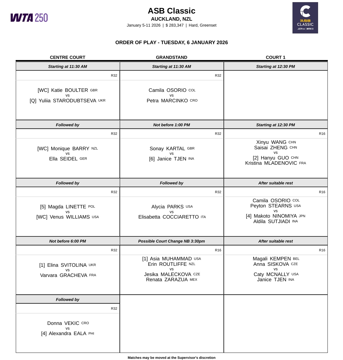 周二赛程📅布里斯班站张帅对决莱巴金娜,萨巴伦卡、凯斯、亚历山德洛娃、穆霍娃出战。奥克兰站大威廉姆斯、斯维托丽娜亮相,维基奇对阵伊埃拉。以下安排均为北京时间👇🎾WTA500布里斯班站📍帕特·拉夫特球场9:00 - 凯斯勒 vs 凯斯随后 - 萨巴伦卡 vs 布克沙不早于18:00 - 莱巴金娜 vs [Q]张帅📍1号场9:00开始三场男单过后[11]穆霍娃 vs [W]汤姆贾诺维奇布兹科娃 vs [15]巴多萨📍2号场预计10:30 - [12]施耐德 vs 波塔波娃随后 - 肯宁 vs 亚历山德洛娃随后 - 科斯蒂亚 vs [14]奥斯塔彭科🎾WTA250奥克兰站📍中心场6:30 - [W]博尔特 vs [Q]斯塔罗杜布采娃随后 - [W]巴里 vs 赛德尔随后 - 里内特 vs [W]大威廉姆斯不早于13:00 - 斯维托丽娜 vs 格拉切娃随后 - 维基奇 vs 伊埃拉📍大看台球场6:30 - 奥索里奥 vs 马辛科不早于8:00 - 卡塔尔 vs 曾丽美随后 - 帕克斯 vs 科恰雷托📍1号场7:30 - 王欣瑜/郑赛赛 vs 郭涵煜/穆拉德诺维奇