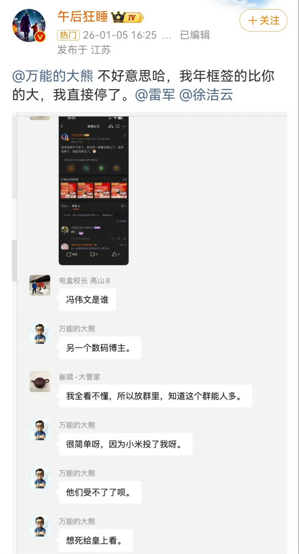 小米立即终止与相关KOL合作 如果投放给米黑,这确实不地道,还好看了米粉的反应,直接取消了。不像我子弹兄,都是在用爱发电,这么多年来,一台小米手机我都没收到,年框就更别想了,我这不还是自己花钱买小米手机支持?我这个米粉的心也要碎了。哎...