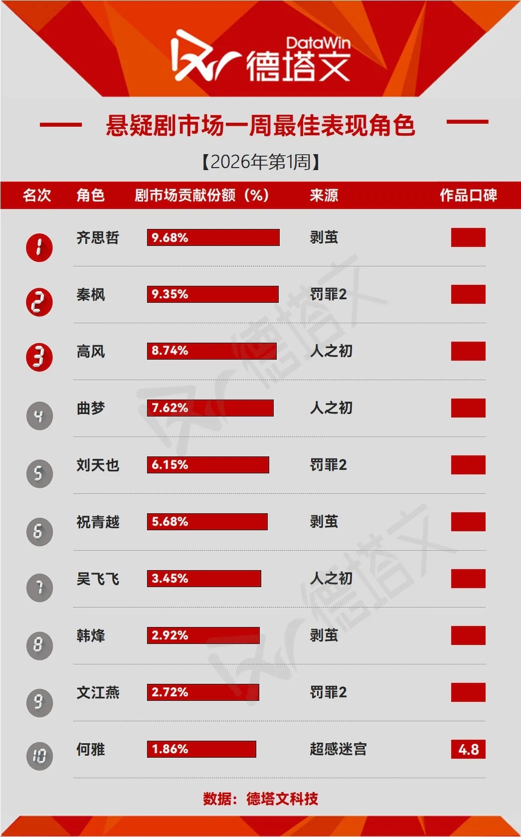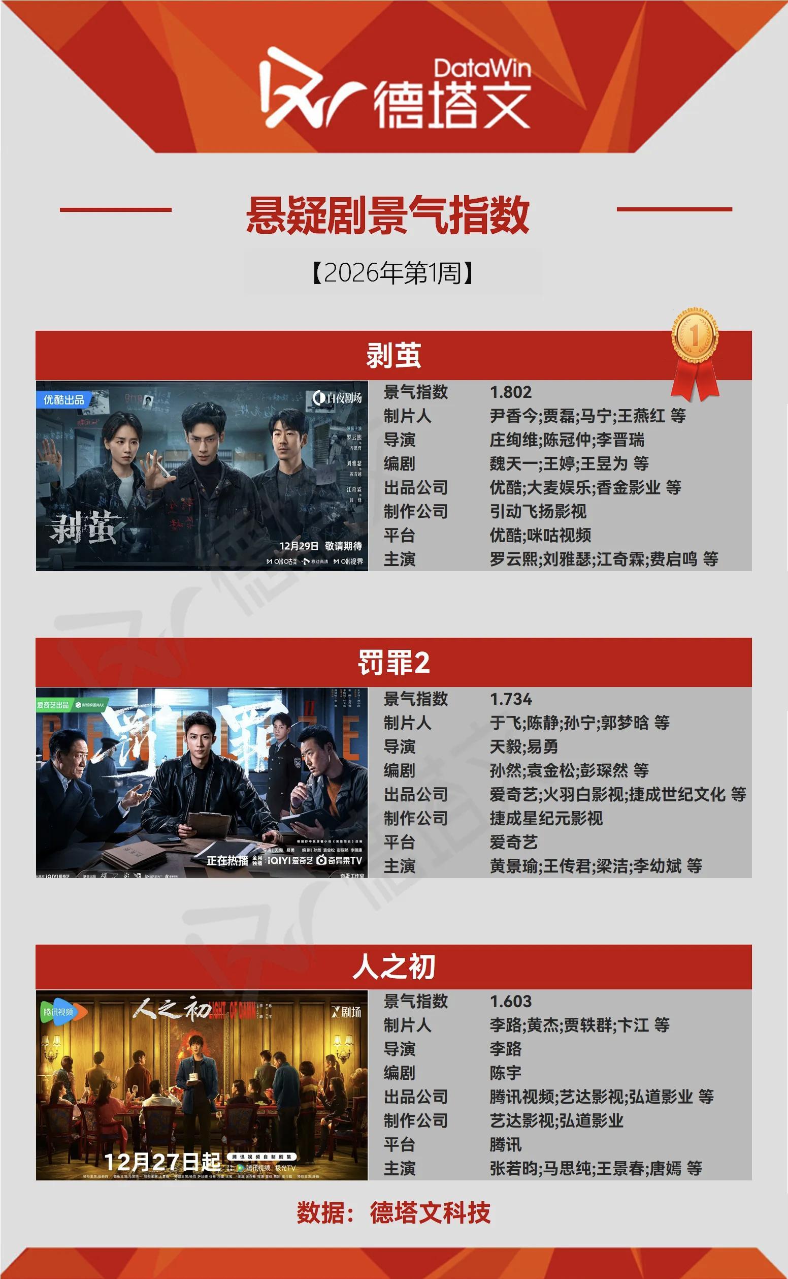 恭喜罗云熙齐思哲、《剥茧》,德塔文指数双登顶:齐思哲,2026年第1周悬疑剧市场一周最佳表现角色;《剥茧》,2026年第1周悬疑剧景气指数TOP1。鬽影縫匠剥茧跨年电影愿