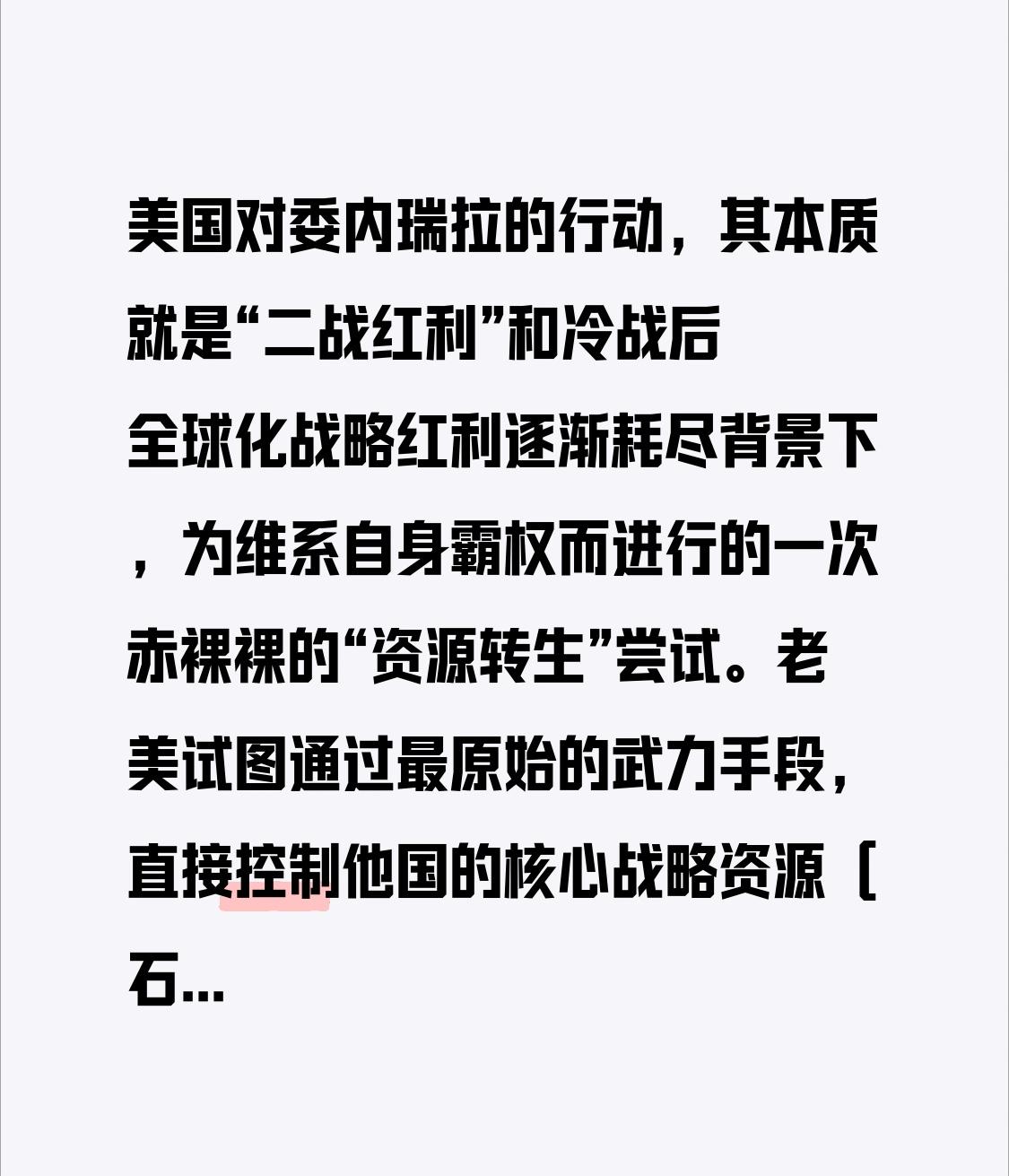 美国对委内瑞拉的行动,其本质就是“二战红利”和冷战后全球化战略红利逐渐耗尽背景下,为维系自身霸权而进行的一次赤裸裸的“资源转生”尝试。老美试图通过最原始的武力手段,直接控制他国的核心战略资源(石油),来弥补其内部的结构性赤字和维系全球霸权体系。