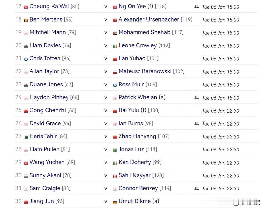 德国大师赛资格赛第一轮,高阳、傅家俊、常冰玉、黄佳浩获胜晋级。姚朋成、刘文炜、许医尘被淘汰。今天晚上,8名中国球员继续出战第一轮,明天凌晨3点,第二轮,贺国强对阵高阳。 资格赛第一轮赛果如下: 高阳5-2胜霍尔沃斯,傅家俊5-1胜许医尘,常冰玉5-1胜奥利弗·布朗,黄佳浩5-3胜吉米·怀特(第8局,黄佳浩66-57逆转),刘文炜2-5不敌齐津斯,姚朋成4-5被阿贾布逆转绝杀。 今晚,资格赛第一轮继续进行,8名中国球员出战,明天凌晨资格赛第二轮,高阳对阵贺国强。 今晚中国球员的出战时间和对阵如下: 18点: 张家玮vs吴安仪 蓝裕豪vs克里斯·托顿 22点30分: 白雨露vs巩晨智 赵瀚洋vs塔希尔 王雨晨vs达赫迪 江俊vs迪克米 明天凌晨3点: 高阳vs贺国强(资格赛第二轮) 白雨露与巩晨智的对决值得关注。