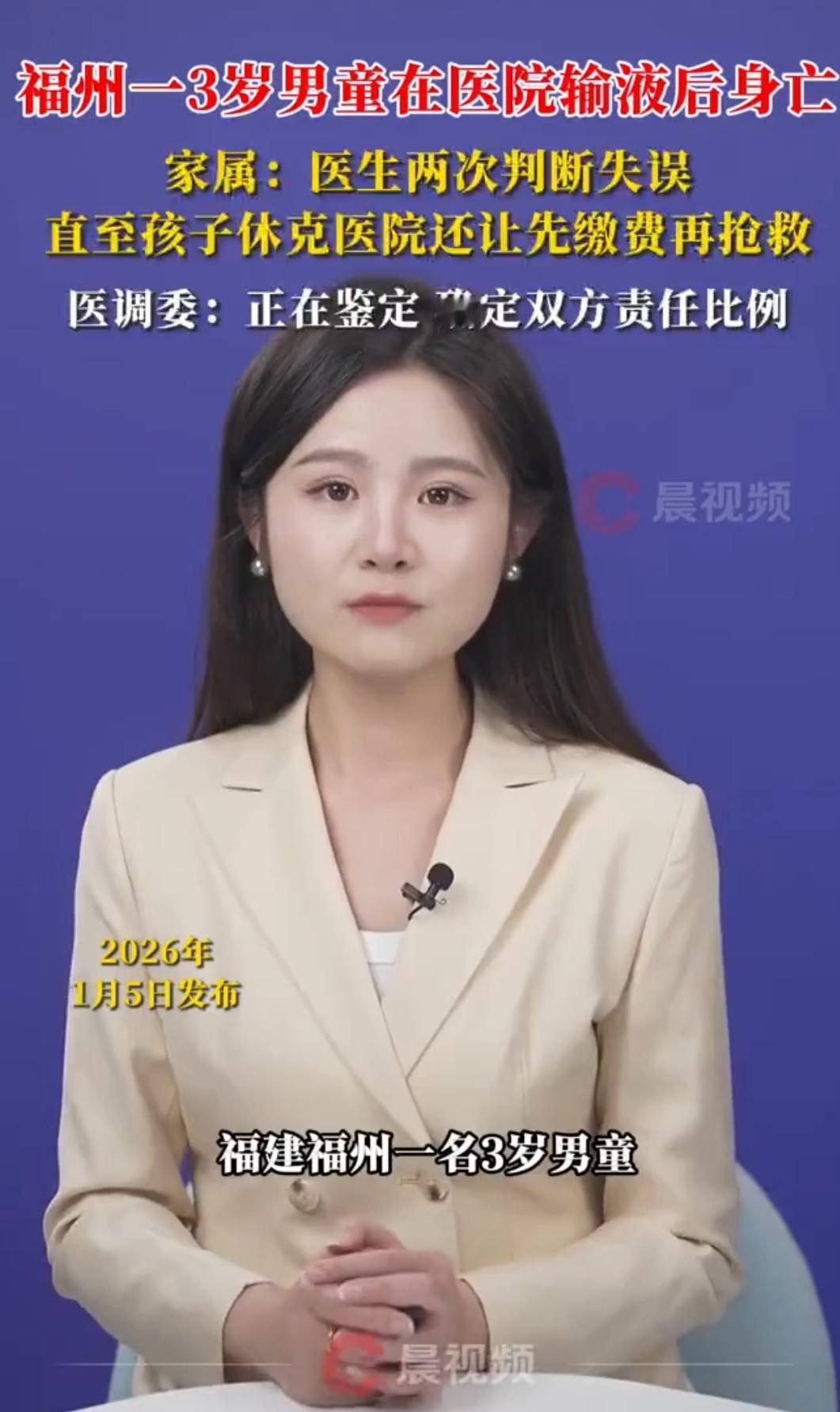 痛心!福州3岁男童输液10分钟突发异常,两次求助被拒,抢救前遭要求先缴费 1月5日,福建福州一起3岁男童输液后身亡的事件引发全网揪心关注。孩子父亲吴先生痛诉,本是带发烧的孩子来医院接受常规治疗,却最终阴阳两隔,而整个过程中的两次求助被忽视、抢救前被要求先缴费的经历,更让这个家庭难以接受。 据吴先生回忆,孩子就诊后做了头孢皮试,结果显示正常,随后开始输液治疗。但令人始料未及的是,输液仅十几分钟,孩子就出现明显异常反应。孩子母亲察觉不对后,先后两次紧急寻找医护人员求助,却均被判断为正常反应,未得到停药处理的建议。 随着孩子状况持续恶化,逐渐陷入生命垂危的境地,家属焦灼等待抢救时,却收到了院方“先去交费再抢救”的要求。这一程序性要求,让本就紧急的救援时机被无情耽搁,最终孩子经抢救无效不幸离世。一个鲜活的小生命戛然而止,留给家人无尽的悲痛与疑问。 事件曝光后,福州市医患纠纷调解委员会已正式介入。工作人员回应称,目前正在开展医疗损害鉴定工作,将通过专业、中立的医学分析,明确医患双方的责任比例,为后续纠纷处理提供依据。 值得关注的是,儿童输液后突发意外并非孤例。近年来福建多地曾发生类似悲剧,有8岁男孩输液后昏迷身亡,也有16个月大男婴挂瓶两小时后口吐白沫离世,多起事件均引发公众对儿童用药安全与医疗应急处置的强烈关注。 目前,关于涉事医院诊疗流程是否合规、医护人员是否存在失职等问题,仍需等待权威鉴定结果。网友纷纷呼吁,生命至上,医疗服务应坚守救死扶伤的底线,在生死关头绝不能让缴费流程成为阻碍,同时需加强儿童医疗安全管理,避免类似悲剧重演。儿童医院悲剧 儿童急诊
