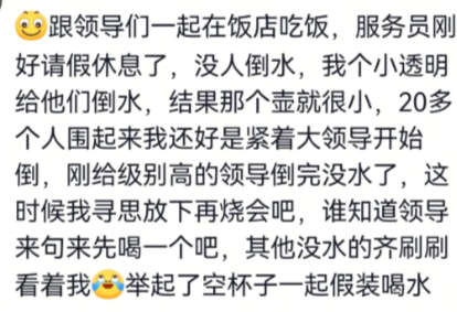 我个小透明给他们倒水,结果那个壶就很小,刚给级别高的领导倒完没水了,这时候我寻思放下再烧会吧,谁知道领导来句来先喝一个吧,其他没水的齐刷刷看着我,举起了空杯子一起假装喝水