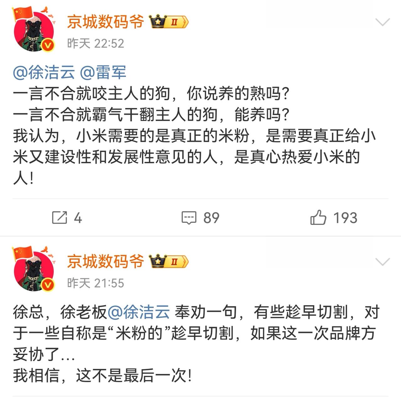 见过娱乐圈的粉丝哭喊着逼着偶像分手的,没见过数码圈的粉丝也能逼宫的。这次的“宫斗”热搜,把雷总4小时拆车直播积攒的好评给冲得稀碎。 雷总直播中说:本以为把产品做好就行了,没想到会被这么尬黑。 雷总您做梦也没想到吧,有些KOL居然有能力让您的公司只能二选一。您的粉丝已经发展到了娱乐圈的水平,一不高兴就会要挟“脱粉”,冲击评论区,甚至对您都有了“掌控欲”。 雷总,是该好好做产品了,离这些人远一些吧。
