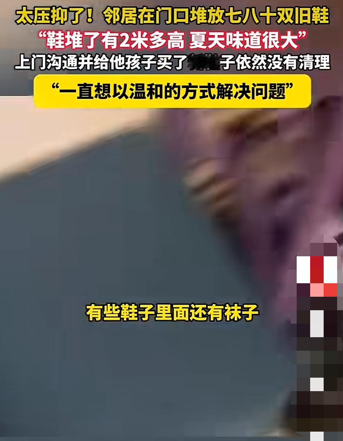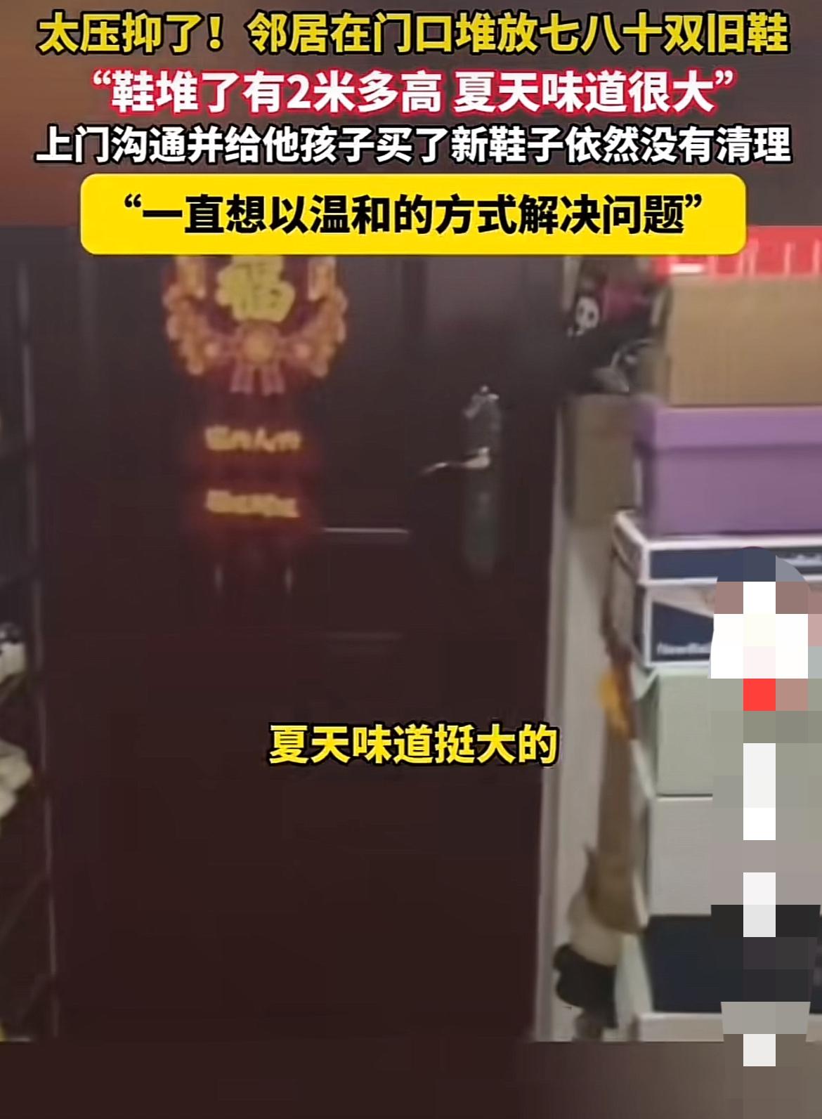 楼道变鞋库?四川男子被邻居“鞋墙”逼疯! “这楼道是公共区域,您堆这么多鞋,我们咋走路啊?”四川崇州的李先生站在自家门口,看着对面邻居家门口那堵近2米高的“鞋墙”,心里直犯堵。这堵“鞋墙”由七八十双旧鞋堆成,不仅把楼道堵得严严实实,夏天还散发着难闻的异味,每天进出都像在“鞋海”里穿行,压抑得不行。 李先生说,这堵“鞋墙”已经存在好几个月了。刚开始只是几双鞋,后来越来越多,最后直接堆成了山。他多次上门找邻居沟通,邻居态度倒是挺好,说家里东西多,实在没地方放,只能堆在楼道里。李先生想着远亲不如近邻,还特意给邻居家孩子买了双新鞋,希望能缓和关系,让邻居把鞋挪挪。可邻居只是象征性地整理了下鞋架,没过几天,鞋又堆回来了。 “这楼道是大家共用的,不是您家的私人鞋柜啊!”李先生无奈地说。他试过找物业,物业也上门劝说过,但邻居就是不听。现在,这堵“鞋墙”成了李先生心头的一块大石头,每天进出都得小心翼翼,生怕踩到哪双鞋摔个跟头。 这楼道里的“鞋墙”不仅影响了李先生的生活,也引起了其他邻居的不满。大家纷纷表示,楼道是公共区域,应该保持整洁畅通,不能被个人占用。有邻居说:“这夏天味儿大得,窗户都不敢开,生怕那味儿飘进来。”还有邻居担心:“这万一着火了,这么多鞋堵着,消防车都进不来,多危险啊!” 大家伙儿都来唠唠,这事儿你们咋看?评论区见! [免责声明]文章的时间、过程、图片均来自于网络,文章旨在传播正能量,均无低俗等不良引导,请观众理性看待本事件,切勿留下主观臆断的恶意评论,互联网不是法外之地。本文如若真实性存在争议、事件版权或图片侵权问题,请及时联系作者,我们将予以删除。