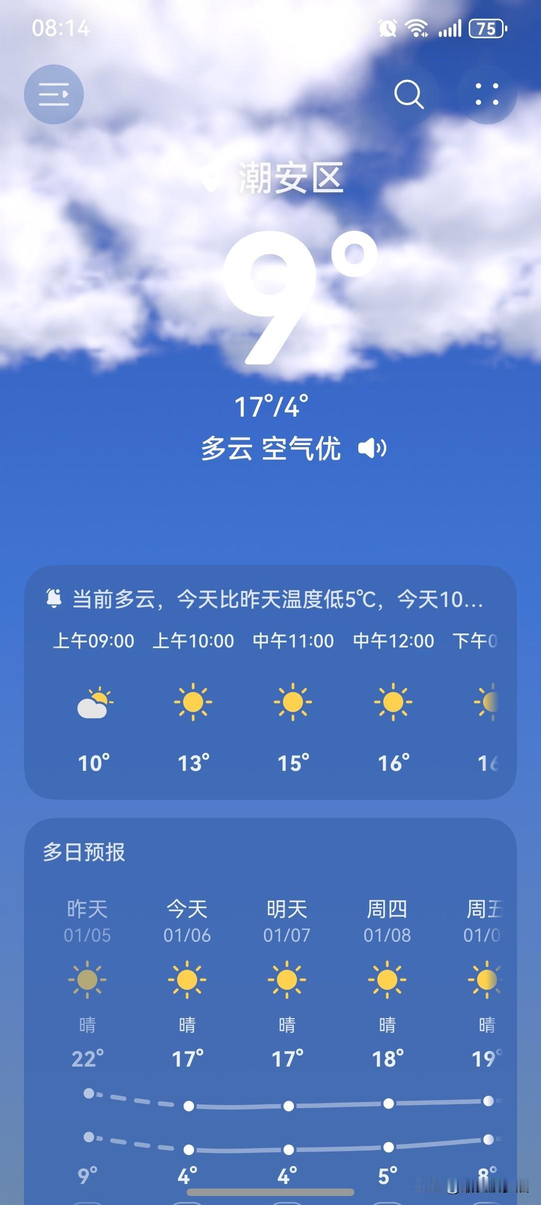 冷冷冷!广东高海拔山区最低气温零下4℃,冷空气又又又来了! 6~7日,继续有弱冷空气补充,气温小幅下降,未来几日广东持续维持晴好干燥天气,早晚寒冷。 今天(6日),潮州喜提一个晴天,但是当前却多云,今天比昨天温度低5℃,气温4~17℃,此刻气温9℃,体感温度6℃。 一起来看看今天的天空!天气阴沉,云量大增,天气画风与昨天的阳光灿烂相差甚远!没有了阳光的加持,体感更加寒冷。 从昨晚傍晚开始刮起了大风,一刮就刮了一夜。早上起来大风继续吹吹吹,气温继续降降降。 早上出门被大风一吹,差点就要退回屋里了,因为实在是太冷了!如果不是要搬砖,这门我可是一点也不想出啊!生活所迫,不得已啊!裹紧了衣服,用手压了压衣领出,免得让寒风往衣服里钻。再大吸一口气,迈着坚定的脚步,勇敢地出门搬砖啦! 今天的这样天气,任谁来了也找不到一丝值得好评的痕迹吧?只能差评了哈! 如此天气!元芳,你怎么看? [我想静静][捂脸][机智][捂脸][我想静静][捂脸][捂脸][我想静静]