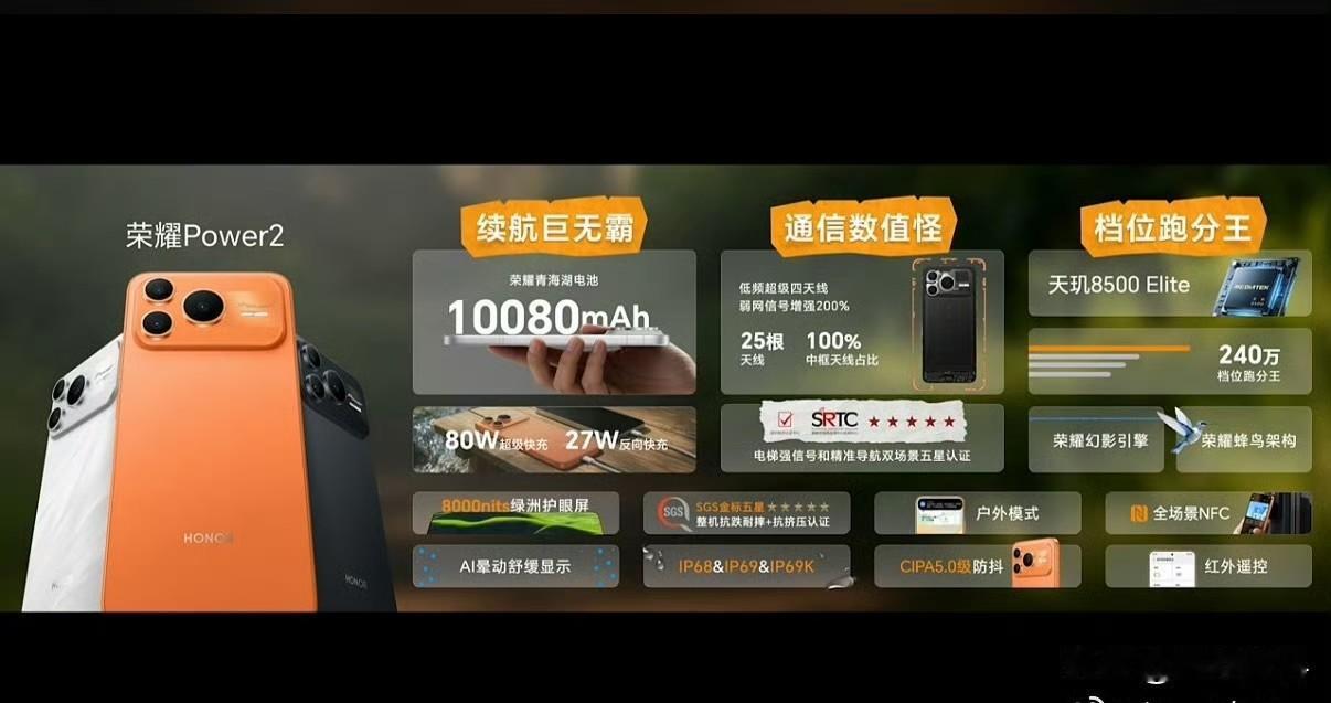目前市面上 非特殊手机中 电量第一的存在 荣耀power2价格 没啥惊喜 但这样的配置 这样的价格 性价比尚可 这款手机 很适合户外工作者 外卖骑手也好 其他户外工作者也罢 都非常适用 电量大 满级防水 信号强 是其主打优势 外观虽有争议 但国人不太介意 这款手机销量 依旧会不错