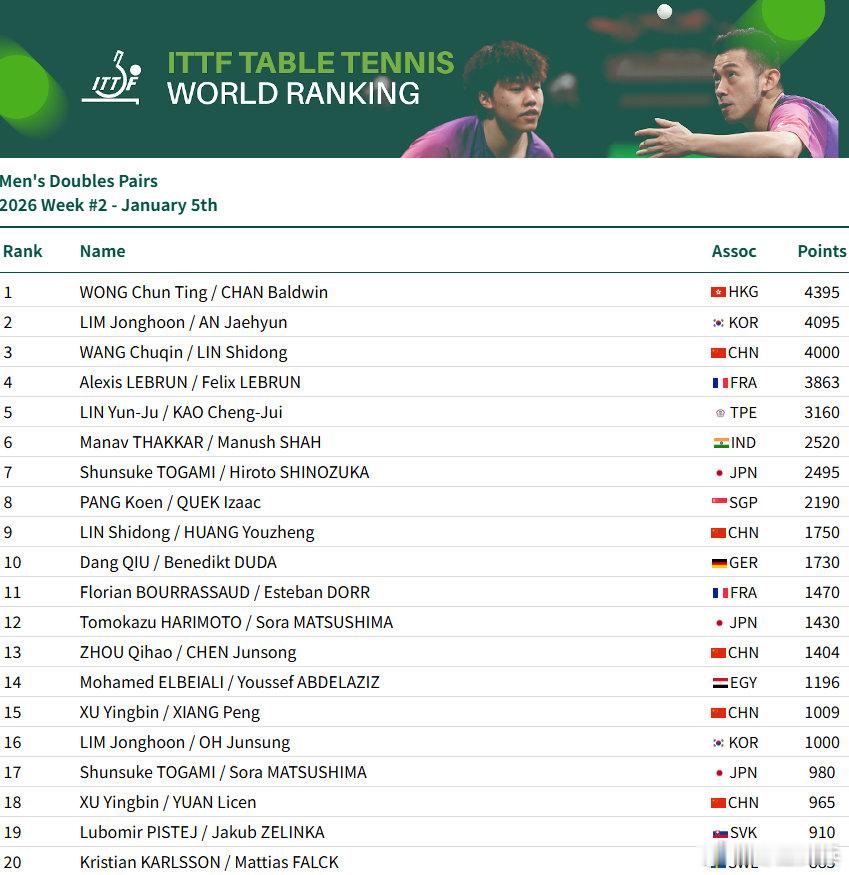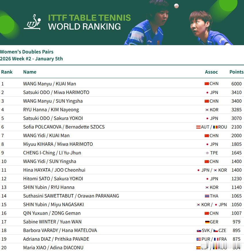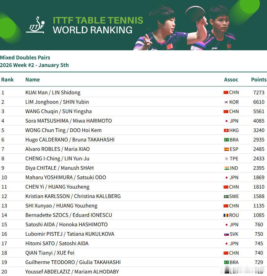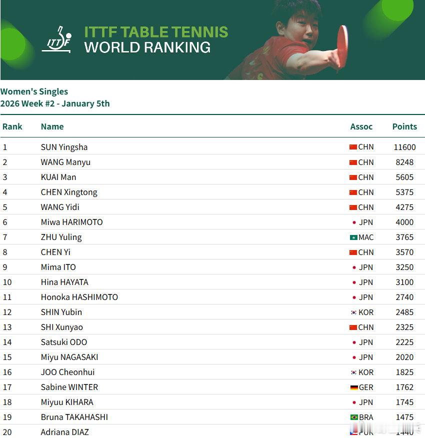 国际乒联2026第2周排名男单:王楚钦9925分、林诗栋位列前二,梁靖崑位列第7,向鹏第11女单:孙颖莎11600分、王曼昱、蒯曼、陈幸同、王艺迪位列前五,陈熠第8男双:王楚钦/林诗栋第3、林诗栋/黄友政第9女双:王曼昱/蒯曼第一、孙颖莎/王曼昱第3、蒯曼/王艺迪第7、孙颖莎/王艺迪第10混双:林诗栋/蒯曼第1、王楚钦/孙颖莎第3、黄友政/陈熠第11孙颖莎连续182周女单第一看WTT上咪咕