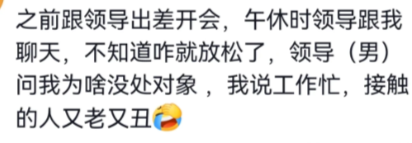 之前跟领导出差开会,午休时领导跟我聊天,不知道咋就放松了,领导(男)问我为啥没处对象,我说工作忙,接触的人又老又丑