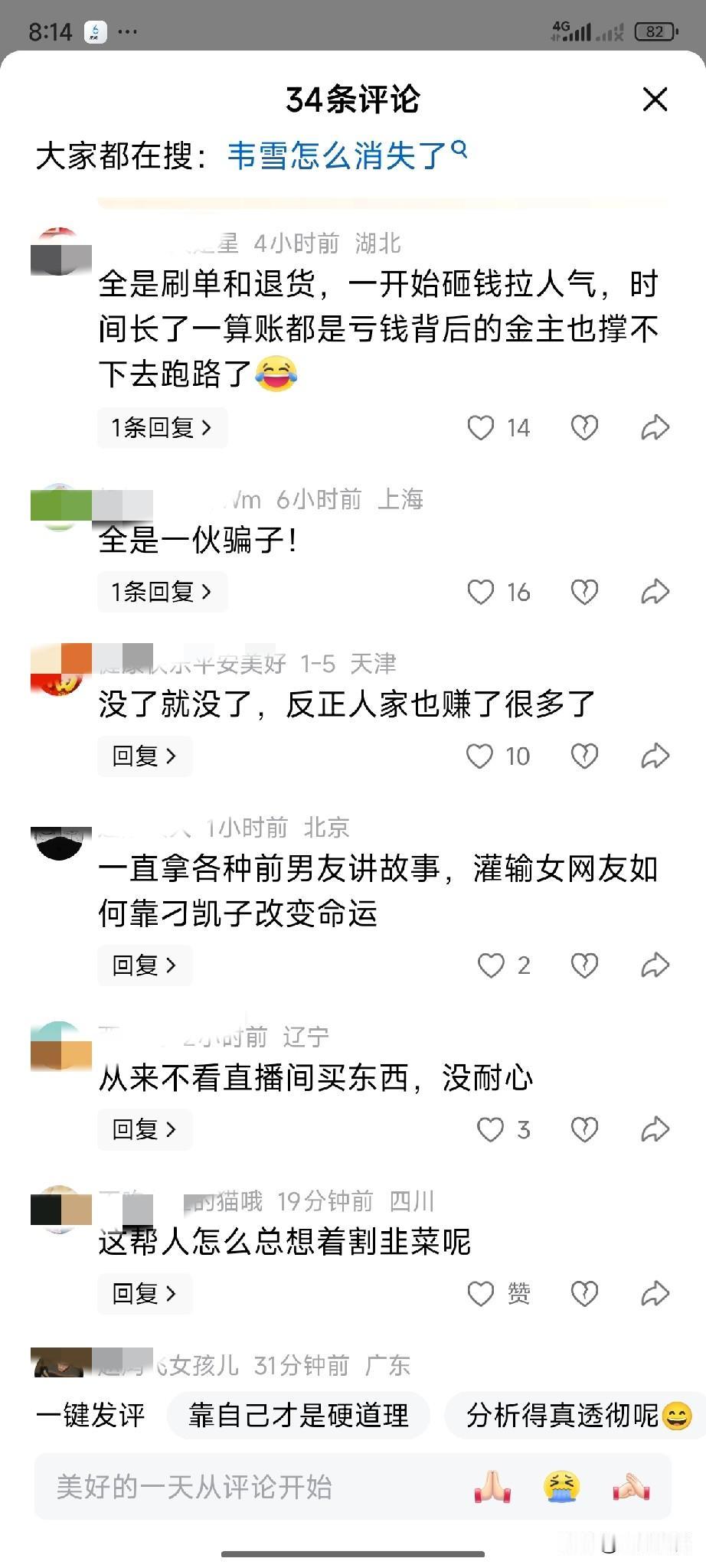 网民们的眼睛很有穿透力,看得准,也很正确,何止韦雪,更多大主播都是靠投流,不过是有的人起步早赚到了,所以自己投,有些人,跟商家合作,老板给他们投流,他们橱窗偷偷挂的是老板的货。 我干了十几天聊天赛道的直播,就知道了那些猫腻,那些五六十、六七十岁的大主播,一个个穷疯了,为了赚钱无底线,直播间谎话连篇,有人投流,拿那套话术,咋说都行,比如:你们看,我用三句话四个动作一个小妙招,就能上人,接着开始厚颜无耻地表演,说:天哪,我只说了一句话就上了那么多人,我的话好不好使?接下来大家认真听,听话照做,未来你们也是大主播,一会再自问自答今天直播到现在一个小时不到就有二十多张大红票子,现在大环境不好,普通草根一听他们这样一说,是不是都心动了?天天扎他们直播间,天天送点花花草草墨镜,聊天主播主要靠直播忽悠赚钱,有的人急于求成,大主播忽悠说:榜单前五十的都是有曝光意识的,大家都去交去带,新人要有曝光意识,提示新人要学会刷礼物占榜,因为榜单前面的都是通过刷礼物占榜的,刷得越多,榜单位置越靠前。有些新人刷了八千多都没有把直播间干起来。 大家如果不信,可以去那些聊天大主播直播间,拉开榜单看看,是不是天天会有同一个在他们的榜单前三?天天给他们刷礼物,那就是商家老板,我误打误撞加了这老板,听完他的直播,才知道这个猫腻,他偷偷招募这种互惠互利的合作伙伴,如果是合法合规的,为啥要让大家加微?他直接指出了这些大主播:寒冰x,笑x妈,南柯一x,平安x,小宇妈x……,再细看这些主播,都是底层老百姓,是不是穷疯了?啥都敢干,撒谎忽悠欺骗别人一点都没有羞耻心和愧疚感,天天像个教授一样接受别人老师的尊称,不脸红,还一口口地说:我没有团队,没有投流。还有一个六十多岁的老太婆,直接在直播间拿个手机当大家面说:我给抖老板打个电话要人,你们看他给不给我,然后一顿表演,真上人了,不知道的人是不是就信她了?天天去趴她直播间,知道的人一看就想吐,就拉黑了。 要不那天还有人说马晓梅没有买流量,我就想这种人不当韭菜谁当? 像韦雪这样的大主播,如果没有直播创新意识,天天靠着那一套,能干几年?就像厨师一样,如果不懂得创新,总是那几道菜,时间长了,人都吃腻了,当然凉凉了。 网民们的觉醒就像一张滤网,筛掉直播假象,让真实回归,互联网应该是真实的、正能量的,而不应该是扶持哭穷卖惨、抖家丑、编故事误导年轻人三观的流量王炸。