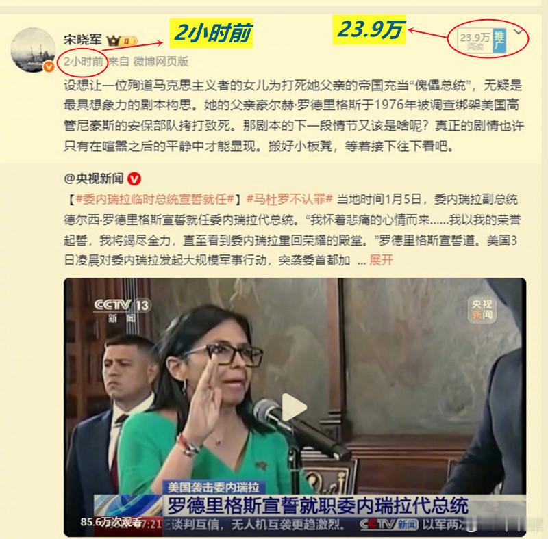 图1:看到我转发的这条微博2小时点击就到了20多万;图2:再借助《大西洋月刊》刚采访完特朗普后写下报道的标题(采访中特朗普说:“她基本上愿意做我们认为必要的事情,让委内瑞拉再次伟大”)——立此存照。看看委内瑞拉这位新领导人接下来的命运如何?等着看吧。你猜的结果是啥呢?