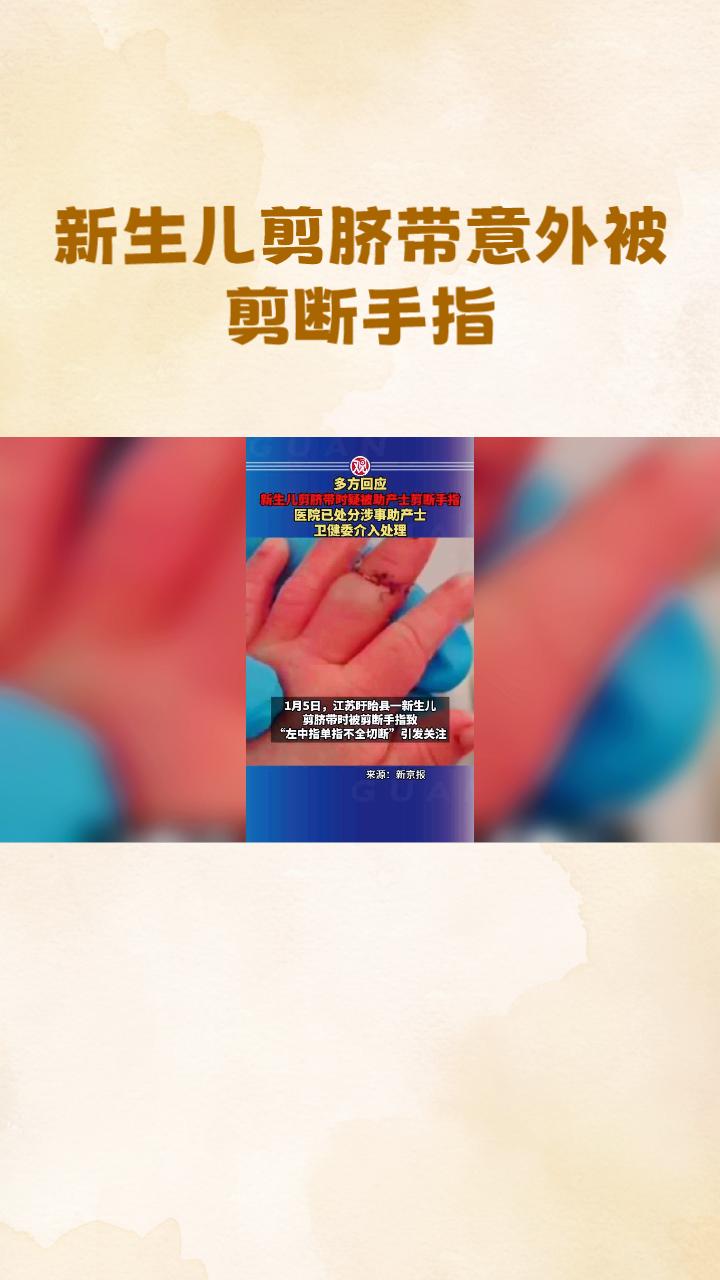 新生儿剪脐带时竟意外剪断手指,这是真的吗?助产士解释称是因孩子突然乱动。 近日,一则关于新生儿在剪断脐带时意外被剪断手指的新闻引发了广泛关注。该事件发生在江苏盱眙县人民医院,据当事人盛先生介绍,其妻子在2025年12月25日进行剖宫产手术时,助产士在剪断脐带过程中不慎将新生儿左中指剪断。助产士事后解释称,这是由于新生儿突然乱动造成的。然而,这一解释并未让盛先生信服:“这么大医院,生孩子剪脐带都能剪到手指,怎么会犯这么低级的错误?”医院方面表示将全力配合患儿治疗,并对所有相关人员进行严肃追责。目前,患儿已在无锡市第九人民医院接受治疗,情况稳定,但仍需等待其完全康复后才能进一步商讨赔偿事宜。此次事件不仅考验着医疗团队的专业水平,也引起了社会对医疗安全的关注。 脐带剪断 胎儿脐带 新生儿护理脐带