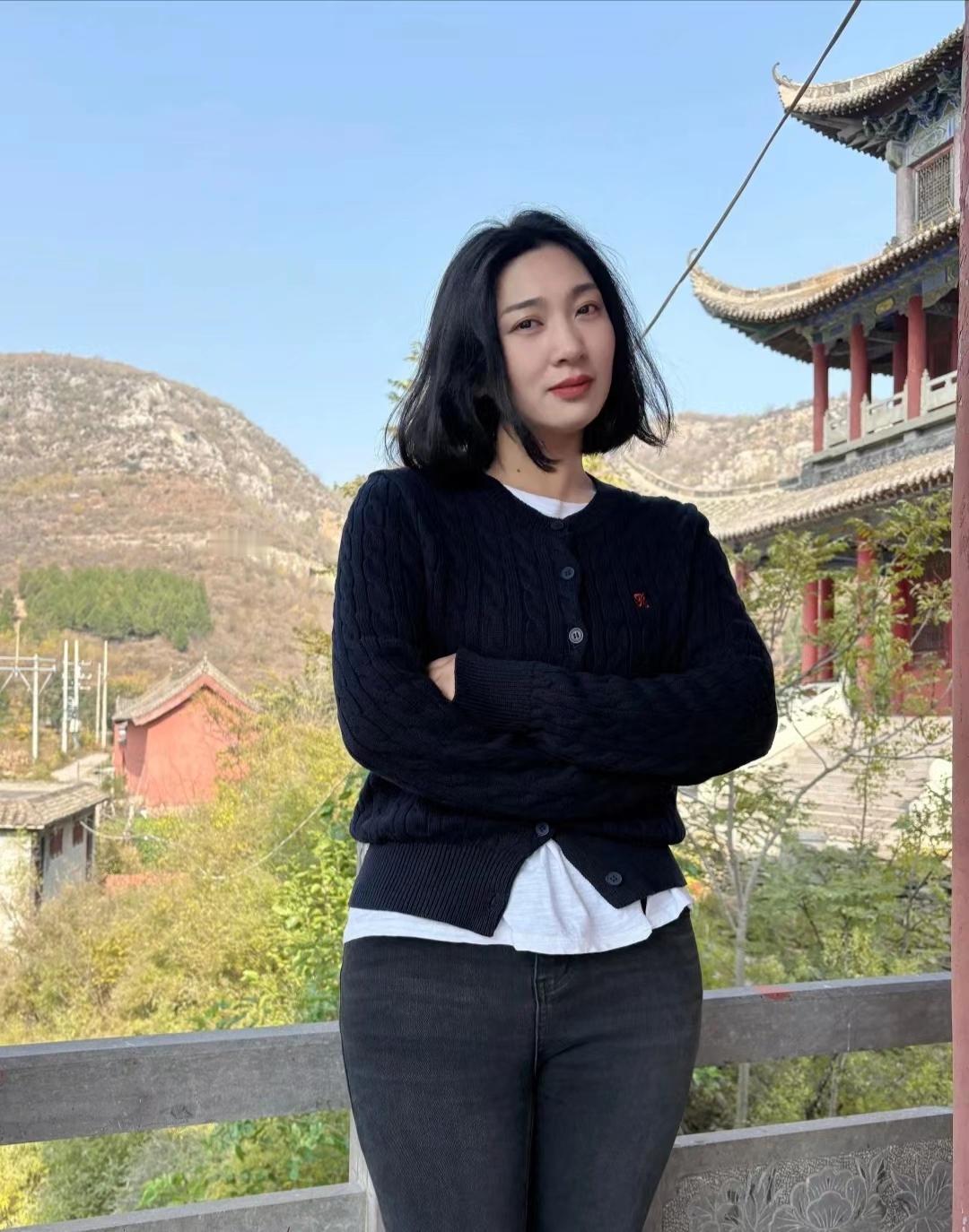 上联:黑衣束影立砖径,自信盈怀,阳光漫染添风致 下联:绿树垂荫映翠姿,从容驻足,