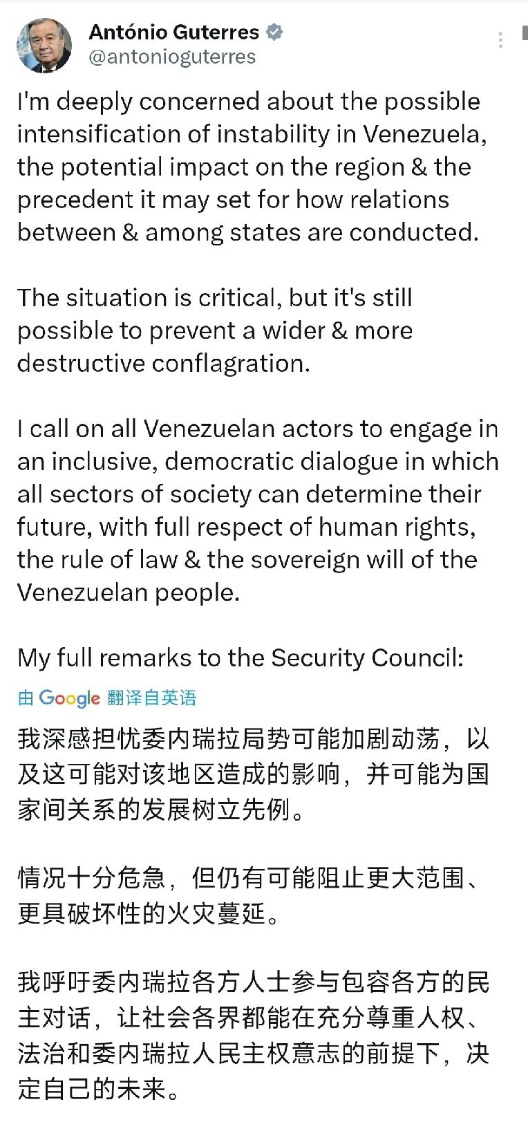 1月6日,联合国秘书长古特雷斯发文称:“我深感担忧委内瑞拉局势可能加剧动荡,并可能为国家间关系的发展树立先例。我呼吁委内瑞拉各方人士参与包容各方的民主对话,让社会各界都能在充分尊重人权,法治和委内瑞拉人民主权意志的前提下,决定自己的未来。” 古特雷斯的发言,没有高调点名批评美国的霸权行径,而是呼吁委内瑞拉各方包容对话。他这种避重就轻的发言,也戳穿了作为联合国秘书长的他不敢得罪美国霸权做法的无奈之举,他的言论没有任何的实质性意义。 对于联合国来说,维护国际秩序,发出正义之声,不仅是联合国权威的体现,更是对受到美国欺负的弱小国家的支持,然而,古特雷斯显然让人很失望。 不得不让人怀疑,联合国在维护国际秩序方面究竟能不能发挥作用,如果连一个主权国家受到美国的欺凌霸权都无动于衷的话,联合国真的就失去了存在的意义。 美国违反《联合国宪章》,悍然对主权国家发动打击,干着霸凌他国的事情,联合国理应第一时间出来谴责,而并不是选择回避,这样只会更加助长美国的霸权野心,为所欲为,想干什么就干什么。 如今的联合国面对霸凌行径不敢亮剑发声,只能说明联合国的地位和权威在下降,面对美国这样不讲道理的国家,也只会更加纵容美国的霸权行径,联合国的作派是时候改一改了。