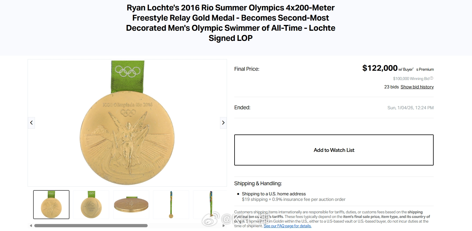罗切特在拍卖网站成功拍卖自己所获得的三枚奥运金牌,分别是04、08、16奥运会男4x200自接金牌,最后时刻经过一番激烈的竞价,最终以总价31.6万美元(不含买家佣金)成交。最高出价在拍卖结束前24小时达到8.3万美元。其中2008年北京奥运会接力金牌出价最高,达到15万美元(含买家佣金18.3万美元)