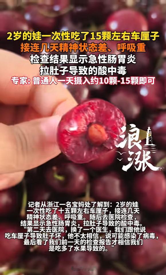 “悲剧还是发生了!”近日,浙江杭州,一小孩一次性吃了15颗左右车厘子,在接下来几天,精神状态都特别差,不仅呕吐还开始拉肚子!送医检查后确诊为急性肠胃炎,并且因为拉肚子导致酸中毒,就连医生刚开始也不相信罪魁祸首是车厘子! 每年冬季都是车厘子大量上市的季节,今年也不例外。随着产地直供渠道的增多,市场上车厘子的价格比往年下降了不少,中等规格的每斤只要三十多元,优质大果也不过五十多元,不少家庭都会买上一些给孩子当水果吃。 在很多家长眼里,车厘子不仅口感好,还富含维生素C、铁元素等营养成分,是补气血、增强抵抗力的优质水果,王女士也是抱着这样的想法才买了不少回家。 王女士的儿子小宇今年5岁,平时就特别喜欢吃水果,不管是苹果、香蕉还是草莓,几乎来者不拒。 1月3号那天下午,王女士把刚买的车厘子清洗干净,装在果盘里放在茶几上,就转身去厨房忙活了。 等她收拾完出来,发现小宇正蹲在茶几旁,一颗接一颗地吃着车厘子,果盘里的车厘子已经少了大半。王女士粗略数了一下,小宇前后竟然吃了15颗,每颗都有硬币大小,算下来差不多有半斤重。 看着小宇吃得津津有味,王女士也没好意思阻止。她想着车厘子是水果,多吃点补充维生素也挺好,而且小宇吃完后没表现出任何不适,蹦蹦跳跳地去玩玩具了,王女士也就彻底放下了心,可到了当天晚上,意外突然发生了。 凌晨一点多,小宇突然从睡梦中醒来,抱着肚子喊难受,紧接着就开始频繁呕吐,刚吐完没多久,又冲进卫生间拉肚子,短短一个小时就吐了三次、拉了两次,整个人瞬间没了精神,蔫蔫地靠在沙发上。 刚开始王女士以为小宇是晚上着凉了,或者吃了其他不干净的东西,就给孩子喝了点温水,吃了点家里常备的止泻药,想着熬到天亮再看看情况。 可接下来的两天,小宇的症状不仅没有好转,反而越来越严重,呕吐和腹泻的频率越来越高,甚至出现了精神萎靡、呼吸急促的情况,连喝水都直犯恶心。看着孩子难受的样子,王女士再也坐不住了,赶紧带着小宇赶往杭州市儿童医院就诊。 接诊的医生详细询问了小宇的症状和近期饮食情况,在得知小宇吃了15颗车厘子后,一开始还表示怀疑。“车厘子本身性质温和,只要新鲜干净,正常食用很少会引发这么严重的肠胃问题。” 医生坦言,一开始他更倾向于小宇是感染了诺如病毒或者轮状病毒,毕竟这个季节正是儿童病毒性肠胃炎的高发期。 但经过血常规、大便常规等一系列检查后,结果显示小宇体内并没有病毒感染的迹象,反而存在明显的电解质紊乱和酸中毒。 结合饮食史综合判断,最终确诊是过量食用车厘子引发的急性肠胃炎,腹泻导致体内水分和电解质大量流失,进而引发了酸中毒。 医生解释说,儿童的肠胃功能还没有发育完全,消化酶的分泌量不足,消化吸收能力远不如成年人。 而车厘子虽然营养丰富,但含有较多的膳食纤维和糖分,膳食纤维会加快肠胃蠕动,过量摄入容易对肠胃造成刺激,糖分则会在肠道内发酵产生气体,两者叠加就容易引发腹胀、呕吐、腹泻等肠胃不适。 尤其是一次性大量食用,肠胃根本无法承受,很容易引发急性肠胃炎,严重时就会像小宇这样出现电解质紊乱、酸中毒等并发症。 事实上,类似的案例并不是个例。近期全国各地都有儿童因过量食用车厘子、草莓等水果引发肠胃问题的报道。 有儿科医生表示,冬季上市的不少水果虽然美味,但家长给孩子食用时一定要控制好量。一般来说,3-6岁的儿童,每天食用车厘子的数量最好控制在5-8颗,而且最好分多次食用。 避免一次性摄入过多。同时,食用前一定要彻底清洗干净,去除表面的农药残留和灰尘,避免引发肠胃感染。 经过几天的输液补水和对症治疗,小宇的症状逐渐得到了缓解,精神状态也慢慢恢复了正常。王女士看着好转的儿子,既庆幸又后悔,她希望自己的经历能给其他家长提个醒。 给孩子补充营养固然重要,但一定要把握好度,千万不要因为孩子喜欢就无节制地喂食,否则反而会伤害到孩子的健康。毕竟,任何食物都过犹不及,健康的饮食习惯才是守护孩子成长的关键。 信息来源:《2岁的娃一次性吃了15颗左右车厘子接连几天精神状态差、呼吸重检查结果显示急性肠胃炎拉肚子导致的酸中毒》浪涨新闻