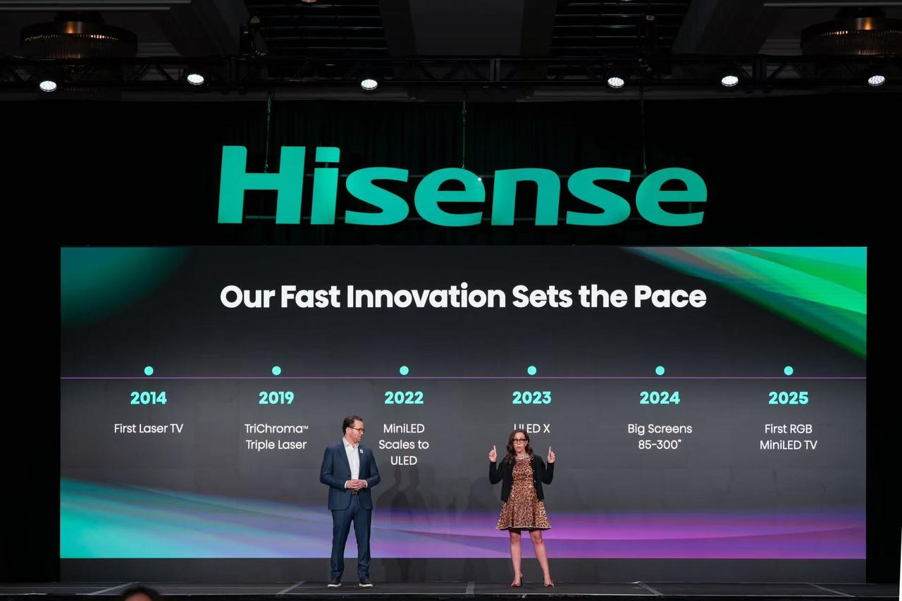 2026展前发布全新一代RGB-Mini LED显示技术,以三大进化引领高端显示行业变革,搭载该技术的UX系列获“CES 2026荣誉奖”,将于2026年3月登陆中国市场。 作为RGB-Mini LED技术开创者,海信此次全球首创玲珑4芯真彩背光,新增天青色自发光芯片,将色域提升至110% BT.2020,较QD-Mini LED、QD-OLED分别提升10%、18%,同时攻克串色、色晕等行业难题。搭配自研信芯AI画质芯片H7,控色精度达134bits,实现全局全亮度高色域,且有害蓝光及能耗显著降低。全链路色彩系统则通过专业校准还原创作意图,带来沉浸式体验。 2025年海信首创该技术后掀起行业热潮,2025年双11期间,其RGB-Mini LED电视占据线下高端大屏近90%份额。奥维睿沃预测,2026年该品类出货量将飙升至50万台,海信以完整产品阵容持续领跑市场。