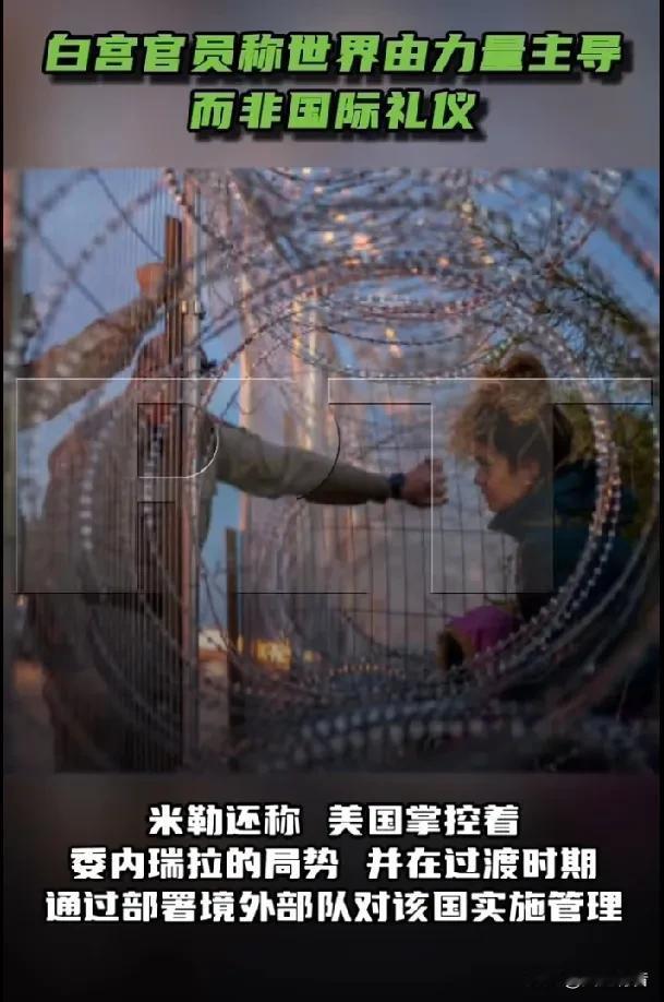 美国白宫官员斯蒂芬·米勒宣称,世界由力量主导,而非国际礼仪。 据《今日俄罗斯》报道,当地时间1月5日,美国白宫办公厅副主任斯蒂芬·米勒在评论美国在委内瑞拉的行动时表示,国际政治的现实运行机制取决于实力,而不是所谓的“国际礼仪”。 他表示:“我们生活在一个可以无休止讨论国际礼仪及其他问题的世界中,但现实世界由力量主导,由实力支配。”他指出,力量和实力仍然是支配世界的“铁律”。 他还称,美国掌控着委内瑞拉的局势,并在过渡时期通过部署境外部队对该国实施管理。他补充说,美国支持对委内瑞拉石油出口实施全面禁运,并掌控加拉加斯开展贸易的能力。他表示,委内瑞拉经济的运转需要获得美国的许可,因此美国在该国局势中仍然保持着完全的控制权。 当天,米勒在电视采访中高呼美国是“超级大国”,并强调:“在特朗普总统的领导下,我们要像超级大国一样行事!”对于格陵兰岛,米勒质疑丹麦对其自治领地格陵兰岛的主权权利,并以“美国才是北约的拳头”为由,叫嚣格陵兰岛“应该成为美国的一部分”。 此外,美国国务院在其社交平台X账号宣称西半球为其专属势力范围:“这是我们的半球。”此前,美国国务院俄语账号发布消息称:“不要与特朗普总统耍花招。” 美国官员这番表态把美国奉行的“弱肉强食、丛林法则”表现得淋漓尽致。