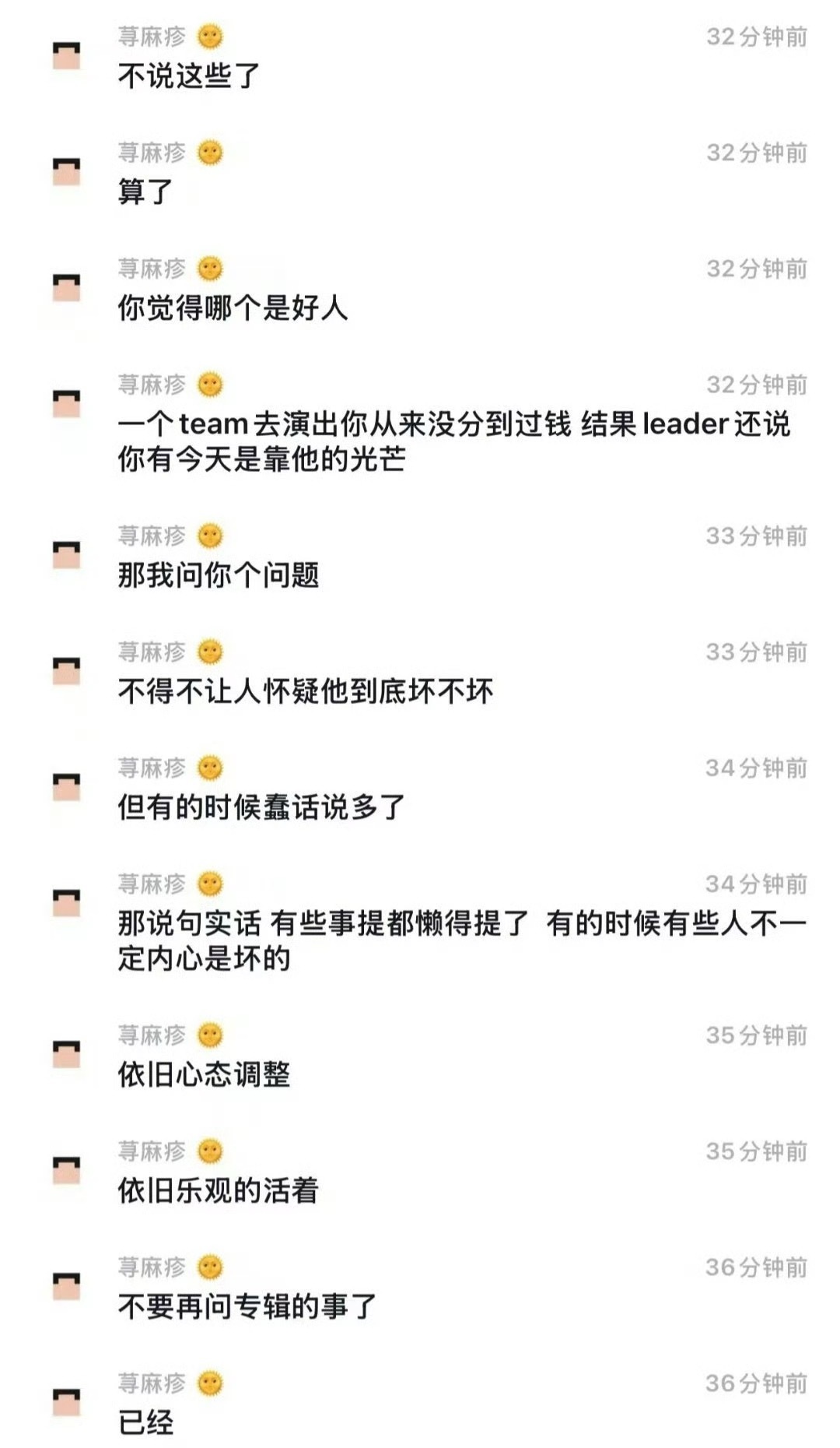 五人组也有情况?五人组制作人荨麻疹回复粉丝问“双胞胎专辑”的事,表示:问他们别问我,闹掰了已经。同时荨麻疹表示:一个team去演出你从来没分到过钱,结果leader还说你有今天是靠他的光芒。我说的和Asen不是一个事。五人组