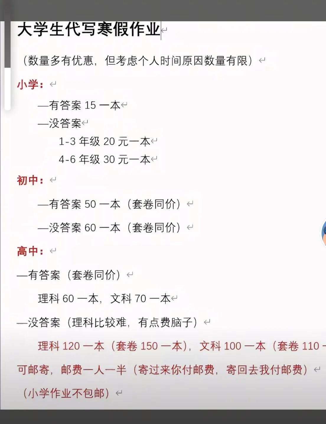 刚刷到一个关于大学生副业的视频, 彻底震惊! 居然是给学弟学妹们代写作业的广告, 我还特地问了下上大学的大侄子, 他说确实是真实的, 他也有同学在做这个代写的副业, 客户中初中生代写的最多, 小学生最洒脱,还有奖励的红包。 我真不知道该夸大学生有头脑会赚钱呢? 还是要说说这些找人代写的学生糊涂呢? 真不知道家长们看到什么感受?