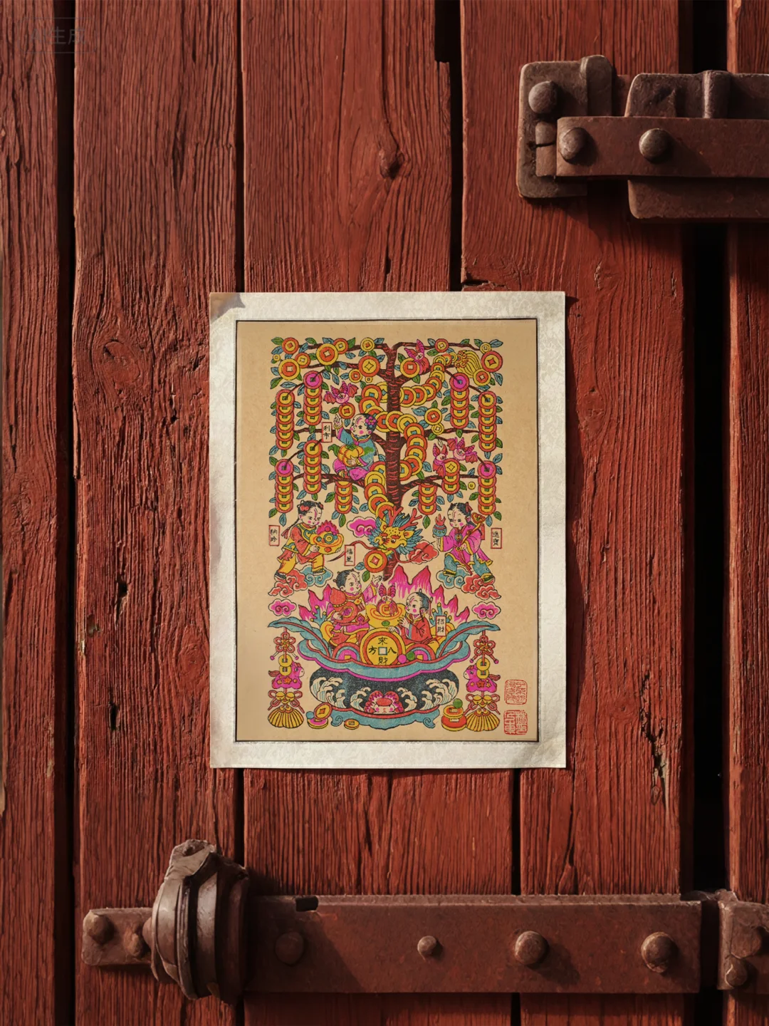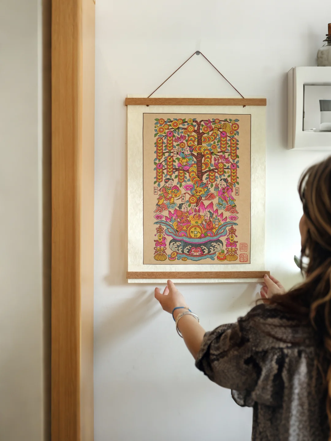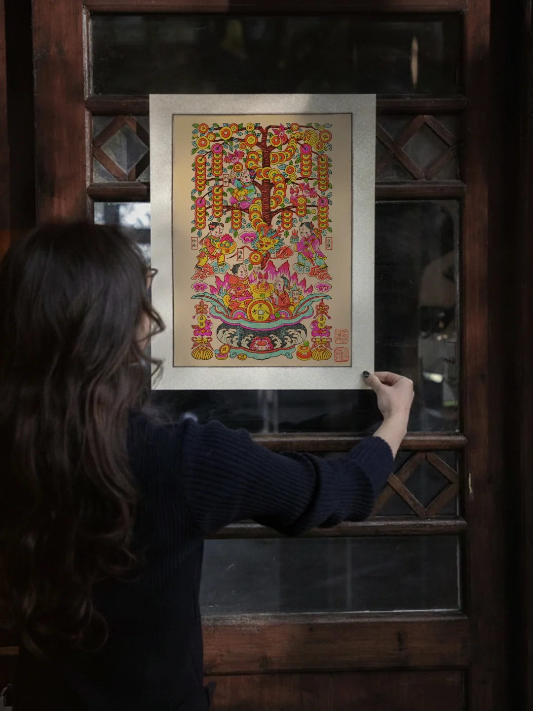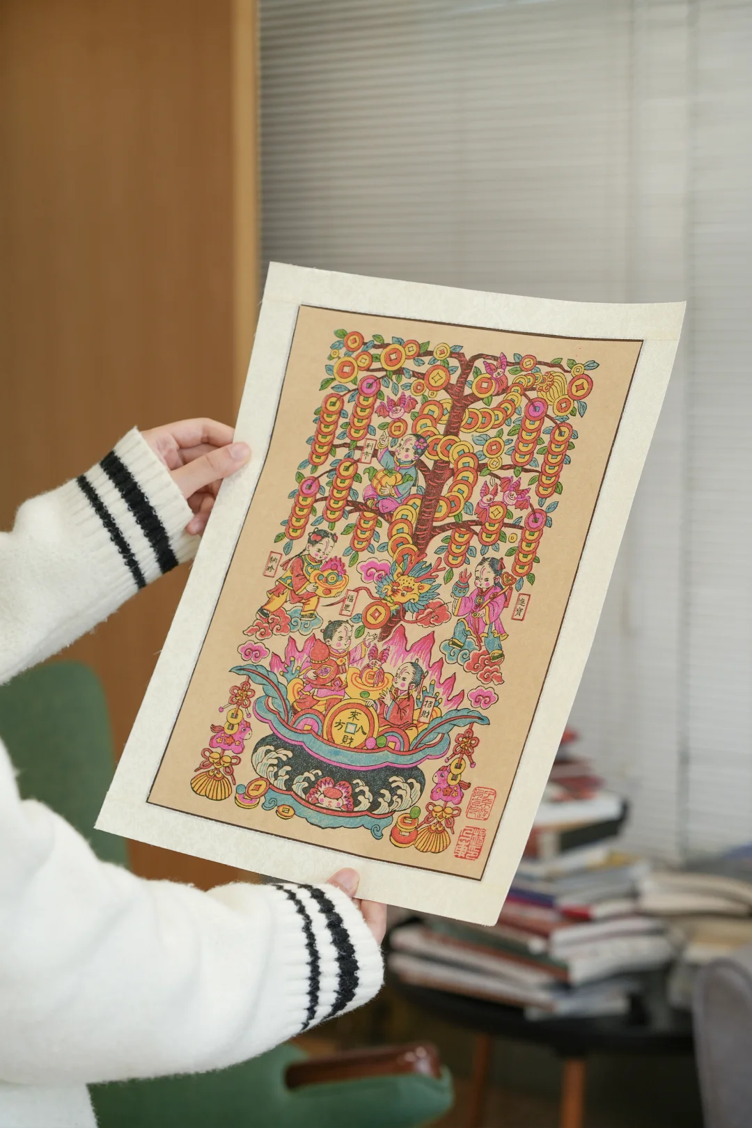 春节不挂年画就不算过年🧨 今年我们做了更适合日常的年画!! 挂一年也不会觉得腻~ 光画面就足足改了30次 人物更加生动活泼 整个画面都特别的喜庆但不俗气 每一张都是手艺人拓印(非工业印刷) 显色度和线条的肌理感都很漂亮!! 可以装裱也可以用吸铁木夹住 直接贴在门上或者墙上也很好看 在马年到来之前 先把好运年画带回家!!