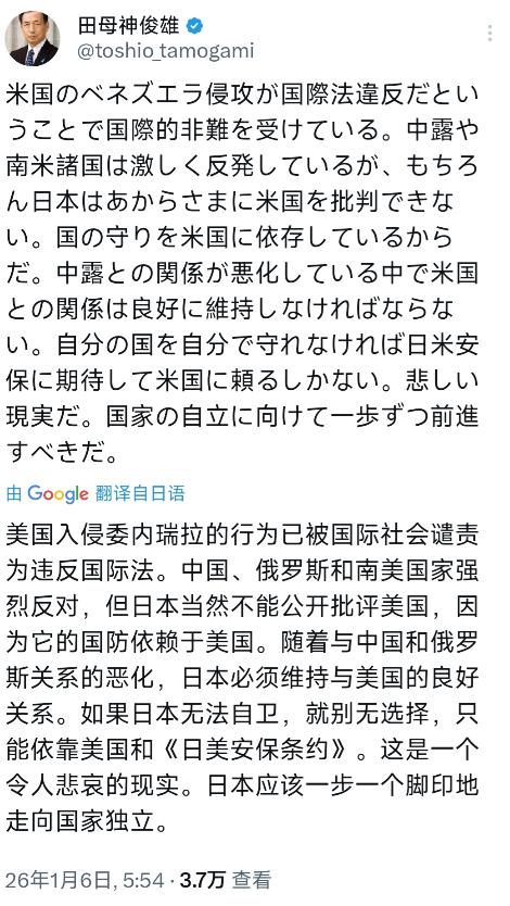日本极右翼政客、前日本航空自卫队幕僚长田母神俊雄今天(1月6日)写道:“美国入侵委内瑞拉的行为已被国际社会谴责为违反国际法。中国,俄罗斯和南美国家强烈反对,但日本当然不能公开批评美国,因为它的国防依赖于美国。随着与中国和俄罗斯关系的恶化,日本必须维持与美国的良好关系。如果日本无法自卫,就别无选择,只能依靠美国和《日美安保条约》。这是一个令人悲哀的现实。日本应该一步一个脚印地走向国家独立。” 这话说得是铿锵有力,但也透着一股子深深的无奈和悲凉,像是一个被生活压弯了腰的中年人发出的最后一声叹息。 田母神俊雄这个人,大家如果关注日本政坛应该都听说过,他可是出了名的极右翼,平时满嘴都是强硬言论,恨不得明天就把自卫队改成国防军。 可就是这么一个看起来最“强硬”的人,在面对美国赤裸裸的霸权行径时,也不得不低下了那颗高傲的头颅。 他在文章里把遮羞布给彻底掀开了,直接承认了日本不敢批评美国是因为国防被人捏在手里。 这种实话实说的风格,在习惯了打太极的日本政坛,简直就是一股泥石流,但也最真实地反映了日本现在的处境。 美国这次在委内瑞拉的操作,那是明火执仗地违反国际法,连很多美国的欧洲盟友都看不下去了,稍微嘀咕了几句。 中国和俄罗斯更是直接站出来对着干,南美国家也是群情激奋,整个世界都在声讨这种强盗行径。 日本作为所谓的“西方阵营核心成员”,G7的一员,这时候本该跳出来维护一下所谓的“基于规则的国际秩序”。 结果呢,日本政府选择了集体失声,装聋作哑,仿佛这一切根本没发生过。 田母神俊雄看得很清楚,这种沉默不是因为没看见,也不是因为认同美国的做法,纯粹是因为不敢。 日本的国家安全体系,是建立在《日美安保条约》这个基础上的,没有美国的庇护,日本这个国家在防御上简直就是裸奔。 尤其是随着这几年中国军力的快速崛起,再加上俄罗斯在远东地区的军事部署,日本心里那是越来越发虚。 他们原本指望靠着美国这棵大树好乘凉,结果发现这棵大树不仅越来越霸道,还越来越喜欢到处惹是生非。 现在惹了事,美国拍拍屁股走了,或者把烂摊子扔给盟友,日本却得跟着一起背锅,承受周边国家的怒火。 这种被绑上战车的感觉,田母神俊雄用“令人悲哀的现实”来形容,确实是再贴切不过了。 他虽然是个右翼,但他至少还有一点正常人的逻辑,知道依附于人的日子不好过,知道当一个没有主权的附庸国是可悲的。 他提出的“走向国家独立”,对于很多日本人来说,可能听起来像是个遥不可及的梦。 现在的日本,连驻日美军犯罪的管辖权都要看美国脸色,连想买点远程导弹都要美国批准,何谈独立。 但这番话也说明了一个趋势,日本国内的焦虑感正在快速上升。 他们越来越意识到,完全押注美国,把自己的一切都绑在美国的战车上,风险实在是太大了。 一旦美国为了自身利益牺牲日本,或者美国自身国力衰落无法顾及日本,日本该怎么办。 这种不安全感,正在日本社会各个阶层蔓延,催生出一种想要摆脱控制、寻求自主的渴望。 不过,咱们也得警惕田母神俊雄这种人的真实目的。 他呼吁独立,并不是想跟中国和俄罗斯好好相处,做一个和平中立的国家。 他的潜台词是,日本应该拥有自己的军队,拥有进攻能力,能够不依赖美国自己去“保卫国家”。 这种极右翼思想的“独立”,如果真的实现了,对亚洲局势来说,未必就是什么好事,甚至可能比现在更危险。 一个摆脱了美国控制、同时又跟中俄交恶、还拥有强大军力的日本,那才是真正的“潘多拉魔盒”。 但不管怎么说,他能把这种“不得不依赖美国”的憋屈说出来,至少让我们看清了美日同盟光鲜外表下的烂疮。 这种同盟关系,从来就不是平等的,而是主子和仆从的关系。 仆从不管受了多大委屈,都得硬着头皮给主子捧场,哪怕主子干的是土匪行径。 田母神俊雄想改变这种现状,想走一条“正常国家”的路,但他似乎还没搞明白,真正独立的根本不在于有多少武器,而在于是否有一颗敬畏和平、尊重邻国的心。 如果一边喊着要独立,一边继续跟着美国搞对抗,那永远也别想真正站起来。 现在的日本,就像是一个得了软骨病的病人,田母神俊雄开出的药方是吃壮阳药,而不是去治根本的病因。 这药方吃下去,不仅治不好病,还可能让病人发疯,最后害人害己。 他这番感慨,咱们听听就好,权当是看了一场日本政客的自我剖析秀。 真正的独立,是建立在自立更生和与邻为善的基础上的,而不是靠跟在霸权背后叫嚣能换来的。