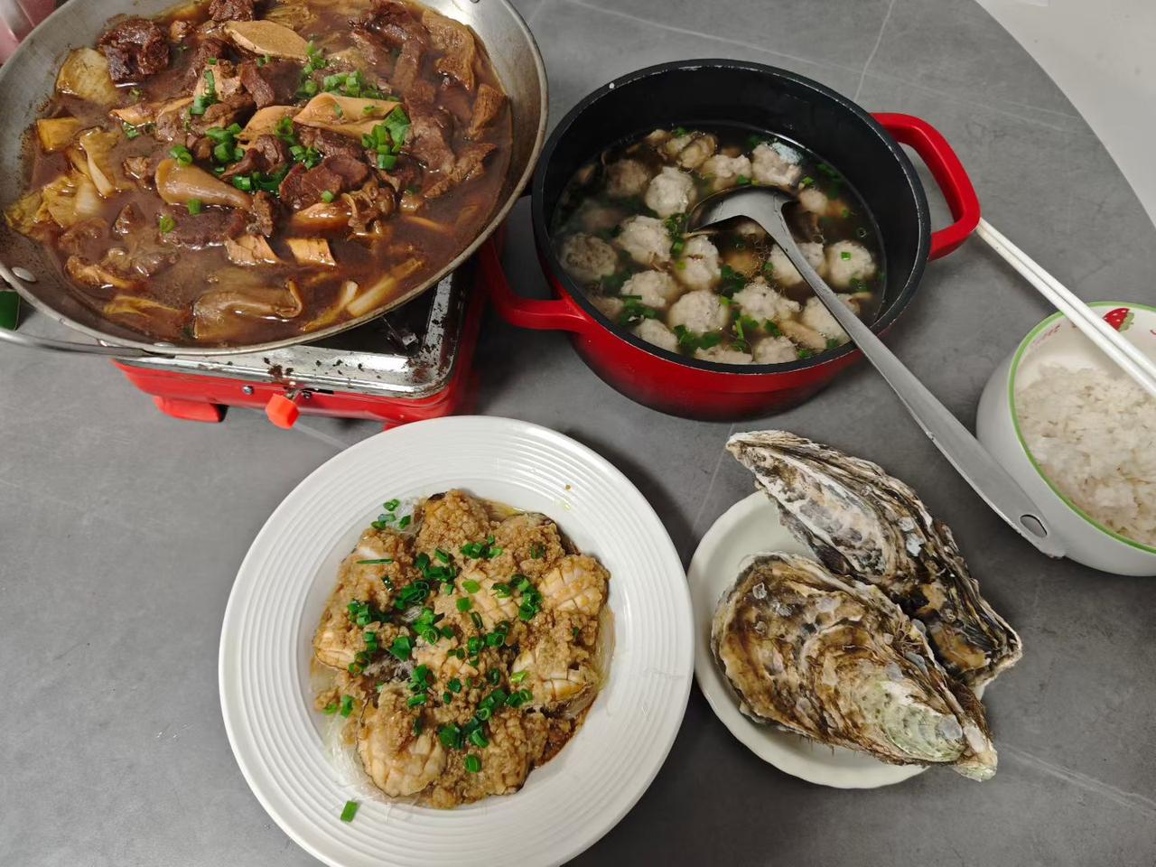 简简单单,又是一餐! 一眼看过去感觉都是荤,有牛肉炖咸菜,下面有配菜压底,两个生蚝,一份肉圆汤,蒜蓉粉丝鲍鱼。
