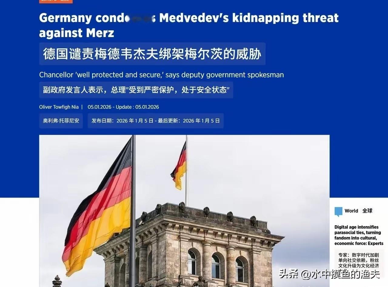 梅德韦杰夫只不过是借着马杜罗事件调侃了一下欧洲。 结果欧洲人居然如此开不得玩笑,德国立刻急眼了。 德国谴责梅德韦杰夫绑架默茨的威胁。 大家看看,刀子架在自己脖子上,他知道疼了。 这哪是调侃啊,分明是戳破了欧洲的遮羞布!2026年1月5日,委内瑞拉总统马杜罗被美国强行控制后在纽约出庭,当庭喊出“我无罪”“我被绑架”,联合国安理会紧急开会,中俄等多国痛批美国违反国际法,可欧洲多数国家全程沉默,连句公道话都不敢说 。 梅德韦杰夫不过是在社交平台提了一嘴,暗讽欧洲对美国的霸凌视而不见,对俄罗斯却动辄上纲上线,德国就跳出来谴责“威胁”,这反应也太耐人寻味了。 要我说,德国急眼不是没原因,梅德韦杰夫的话刚好戳中了默茨政府的痛处。默茨这个德国总理,2025年5月才通过两轮投票当选,法学出身的他,当年为了重返政坛、组建执政联盟,可是把对俄强硬当成了“敲门砖” 。 上任前就放狠话要考虑摧毁克里米亚大桥,还支持给乌克兰提供射程500公里的金牛座导弹,甚至说要解除援乌武器射程限制,让乌军能打俄罗斯境内目标 。他以为这样能讨好美国和中东欧国家,却忘了俄罗斯从来不吃这一套。 梅德韦杰夫对默茨可没少“关照”。早在2025年3月,默茨在联邦议会说“普京的战争针对欧洲”,梅德韦杰夫直接怼他“像戈培尔一样撒谎”,还提了他父亲曾在纳粹国防军服役的往事,骂他“步纳粹后尘”。 这次借着马杜罗事件,梅德韦杰夫不过是旧事重提,暗指欧洲纵容美国的“绑架”行为,自己却受不了一点“威胁”暗示,德国的反应纯属色厉内荏。 默茨政府的强硬立场,早就让德国陷入两难。2025年5月,他宣布出资57亿美元支持乌克兰本土生产远程武器,说是“新型军事工业合作”,实则把德国直接绑上了俄乌冲突的战车 。 俄罗斯外交部当即警告,德国这是“再次成为敌人”,一旦这些武器打向俄本土,俄方必将反击。德国国内民众早就怨声载道,能源价格上涨、通胀高企,大家都明白,跟着美国对抗俄罗斯,最终吃亏的是自己。 欧洲的双标在马杜罗事件上体现得淋漓尽致。美国公然军事干涉他国内政,强行带走一国总统,这在国际法上纯属“绑架”,可欧洲各国要么沉默,要么含糊其辞,没一个敢站出来谴责美国。 反观俄罗斯,只是通过官员言论表达不满,欧洲就立刻跳脚,德国更是第一时间发声谴责。这种双重标准,难怪梅德韦杰夫要忍不住调侃。 梅德韦杰夫的风格一直如此,犀利直接,专戳痛点。之前德国外长贝尔伯克说“欧洲在与俄罗斯交战”,他直接骂对方是“彻头彻尾的有用傻瓜”,一点情面都不留。 这次他借着马杜罗事件发声,本质上是揭露了欧洲的困境:一边依赖美国的安全保护,不敢违逆美国的意志;一边又害怕俄罗斯的反击,担心冲突升级波及自身。刀子没架在自己脖子上时,欧洲敢跟着美国指手画脚,真感受到威胁了,就立刻急眼谴责,这种心态实在可笑。 更有意思的是,美国前陆军上校都预测,未来一年内,德法英三国支持俄乌冲突的领导人可能会卸任,因为民众反战求和平的呼声越来越高。 默茨政府现在越是强硬,越难向国内民众交代。梅德韦杰夫的一句调侃,不过是让这种困境暴露在公众视野里,德国急眼也没用,毕竟纸包不住火。 国际政治从来都是实力说话,双标和强硬换不来安全。欧洲如果继续纵容美国的霸权行为,对俄罗斯奉行对抗政策,最终只会把自己推向危险的边缘。梅德韦杰夫的调侃,更像是一记警钟,提醒欧洲该清醒清醒了。 各位读者你们怎么看?欢迎在评论区讨论。