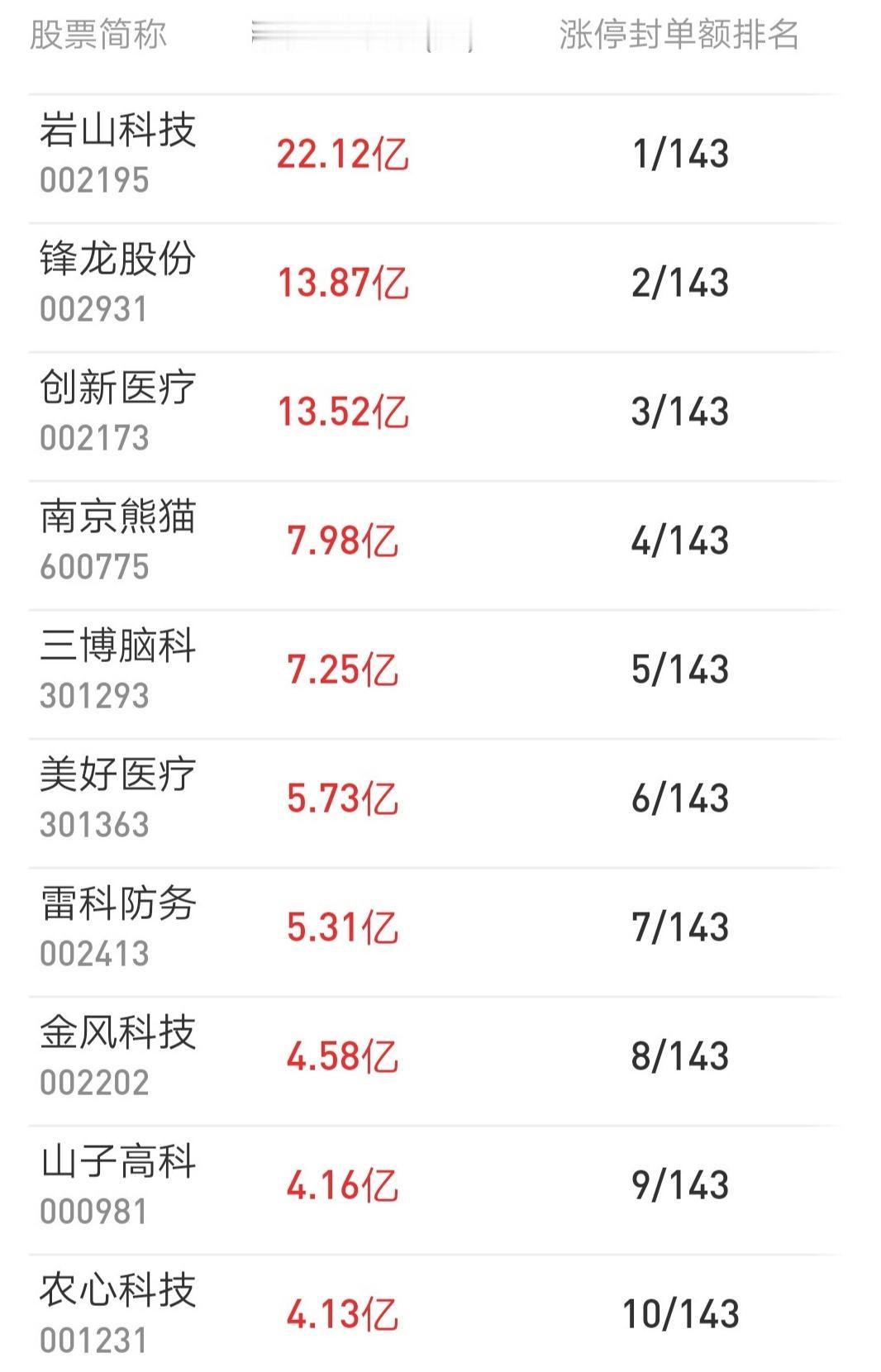 A股今天封板力度最强的十只票 118股涨停比昨天又增加了11只 连板高度和趋势高度完全打开了 再加上产业利好频发,个股井喷式涨停 非要说哪些个股更强,只有用数据说话 岩山科技,22.12亿元 锋龙股份,13.87亿元 创新医疗,13.52亿元 南京熊猫,7.98亿元 三博脑科,7.25亿元 美好医疗,5.73亿元 雷科防务,5.31亿元 金风科技,4.58亿元 山子高科,4.16亿元 农心科技,4.13亿元