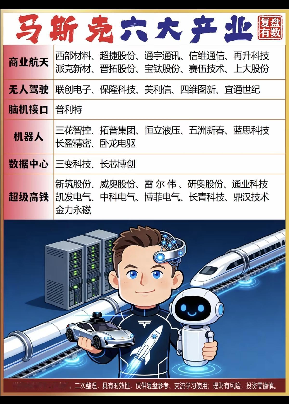 马斯克六大产业:A股核心关联龙头股! 1.商业航天 2.无人驾驶 3.机器人 4.数据中心 5.脑机接口 6.超级高铁