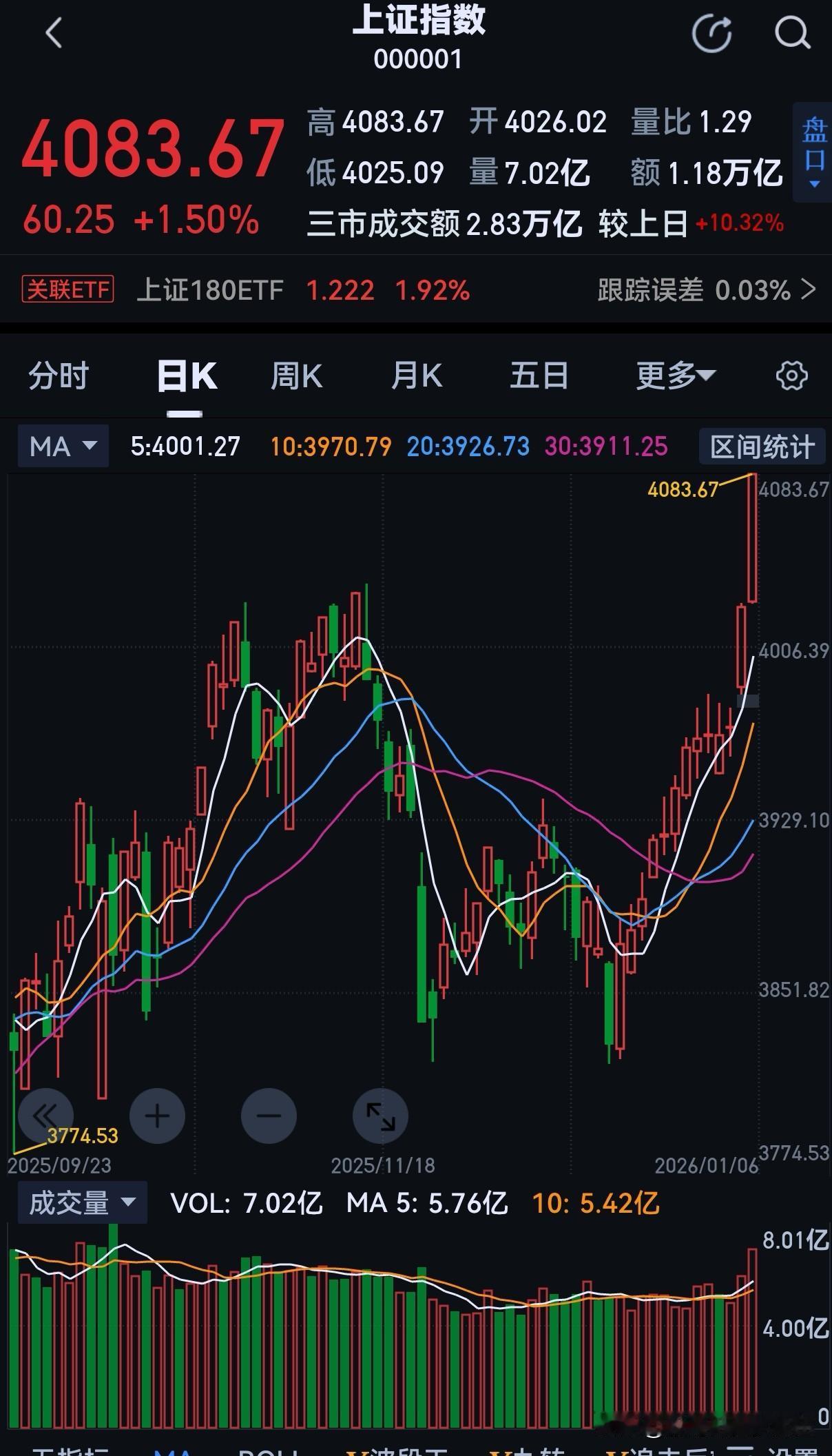 春季躁动行情已经开启!2026年开年两日连续大涨,逼空行情已经展开。 昨日大涨1.38%,成交量放大至2.5万亿之上;今天大涨1.50%,成交量再度放大到2.8万亿。两日大涨115点,量价齐飞,暴涨行情开启。 不要怀疑主力做多的意图,年末小跑,年初狂奔,为的是不给场外犹豫资金抢筹机会。2024年的924行情,在2026年的开年已经开始。接下来,更大的涨幅会不断到来,4500点之前也许不会有大的调整机会。主力就是要让前期对4000点之上牛市结束的离场者付出更高成本去拿筹码,他们没有进场之前,指数会一路狂奔。 一年之计在于春,而对于A股春天已经提前到来。不要怀疑这一轮躁动行情,坚定信心,积极加仓做多才是对牛市的尊重! 股市分析 今日A股 上证指数
