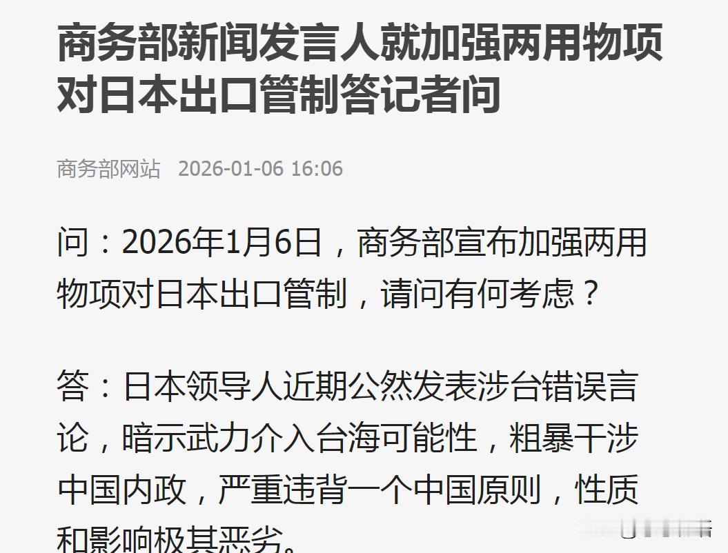 中方耐心耗尽,终于对日祭出杀招!在1月6日的商务部新闻发布会上,我国商务部发言人郑重声明:“中方决定禁止所有两用物项向日本军事用途、军事用途,以及一切有助于提升日本军事实力的其他最终用户用途出口。” 咱们的这个招数威力有多大?去问问美国就知道了,世界头号强国都被我们打的不得不低头,何况一个小小的日本? 综合各种资料来看,日本对我国的稀土依赖度约为60%,2010年的这个数据大约是90%。 与2010年的数据相比,虽然有所降低,但日本对我们的稀土依存度不同领域存在显著差异,比如在电动汽车、风力发电等领域的重稀土元素依存度几乎是100%,汽车产业达75%、电子产业达88%、军工产业达92%。不论从哪个方面看,我们的这个大招对日本的打击都是致命性的。 自从高市发表错误涉台言论以来,我们采取了一些反制措施,但说实话,这些措施都伤不到根本,其实我们这也是在给日本反省纠错的机会,但高市不仅不知反悔纠错,反而加速复活军国主义的进程。 现在好了,咱们的耐心耗尽了,终于祭出了大招,日本很快就会鬼哭狼嚎,最终也的向我们低头!