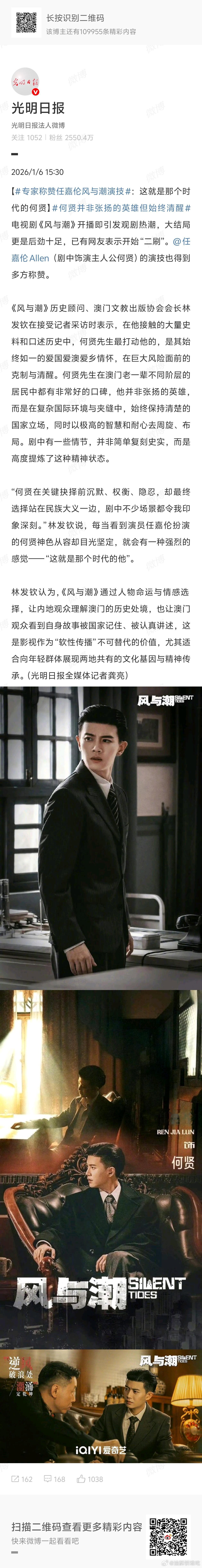 官媒又夸夸风与潮了!《风与潮》历史顾问、澳门文教出版协会会长林发发钦高度称赞任嘉伦:“每当看到演员任嘉伦扮演的何贤神色从容却目光坚定,就会有一种强烈的感觉 这就是那个时代的他”任嘉伦演这部剧太值了 ,真互相成就!