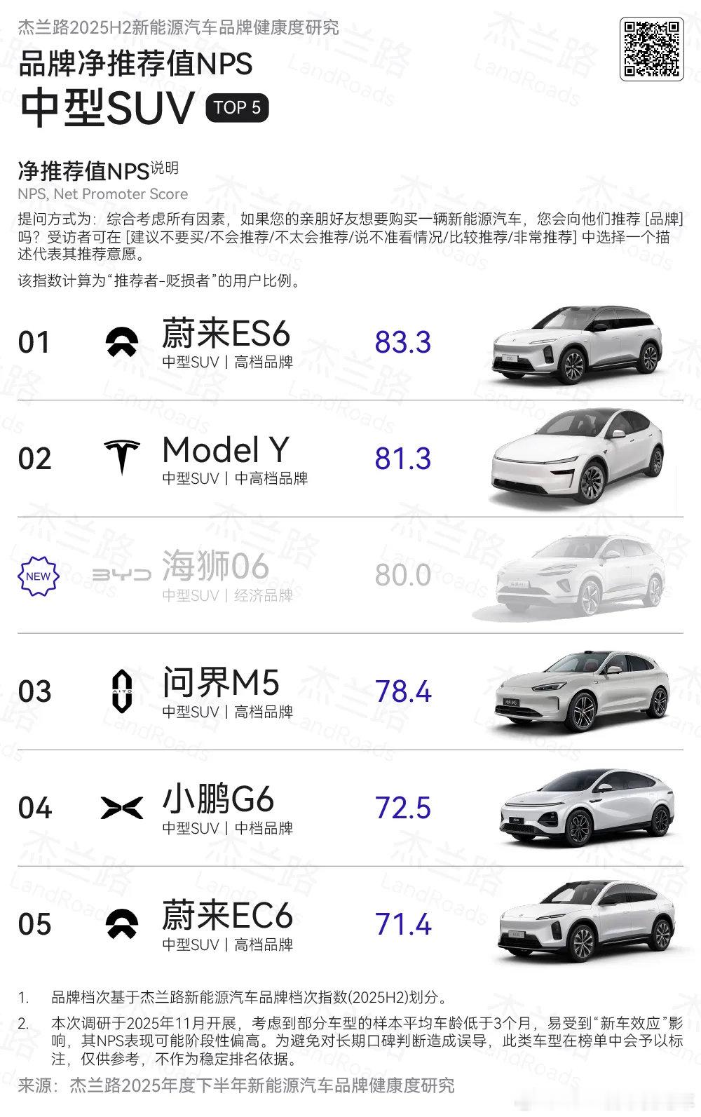 蔚来ES6在中型SUV的NPS排名第一,影响中ES6一直都是这个品类中的王者,六边形战士。NPS排名前五的车型依次为:蔚来ES6(83.3)、Model Y(81.3)、问界M5(78.4)、小鹏G6(72.5)、蔚来EC6(71.4)。
