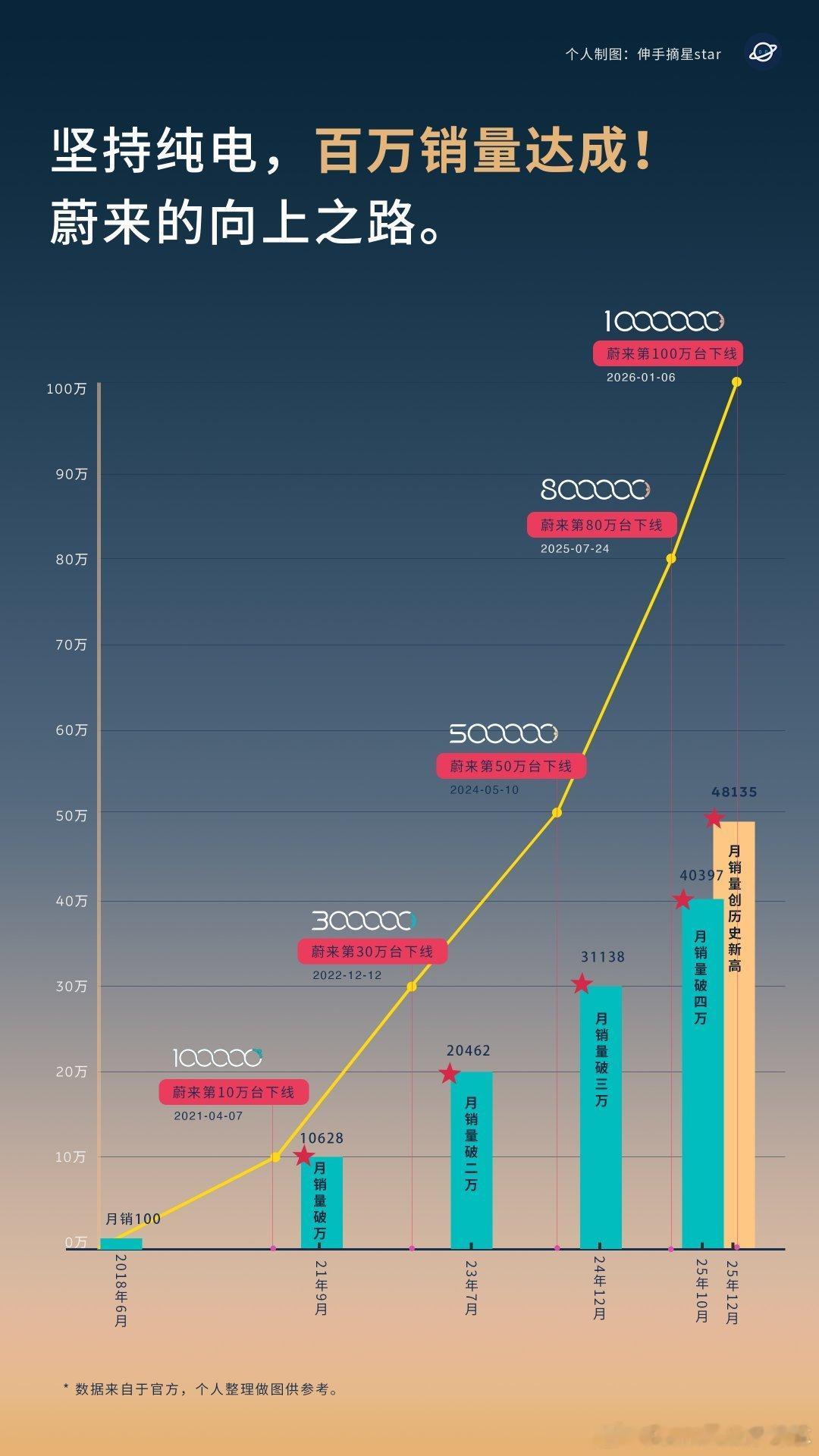 全球坚持纯电的唯二企业,一个在美国,一个在中国,蔚来的100万台交付,非常的纯净,不含一滴油,这个数据在竞争如此激烈的中国市场,成绩斐然。2023年交付16万台,2024年交付22万台,2025年交付32.6万台,也就是说近三年交付了70万台,占比70%以上,蔚来集团的销量数据在不断提升,一方面说明蔚来自身的竞争力在不断提升,另一方面也说明整个纯电行业也在不断扩大。眺望远方,希望未来能够以更快的速度完成第二个100万以及第三个、第四个……第N个蔚来加电,未来以来。蔚来汽车