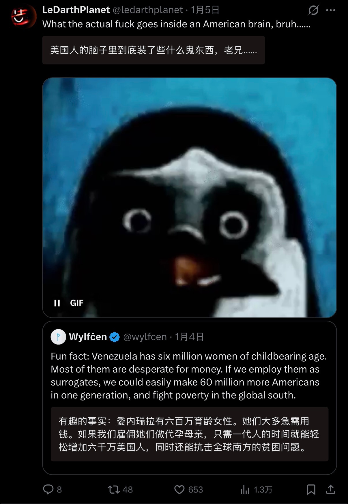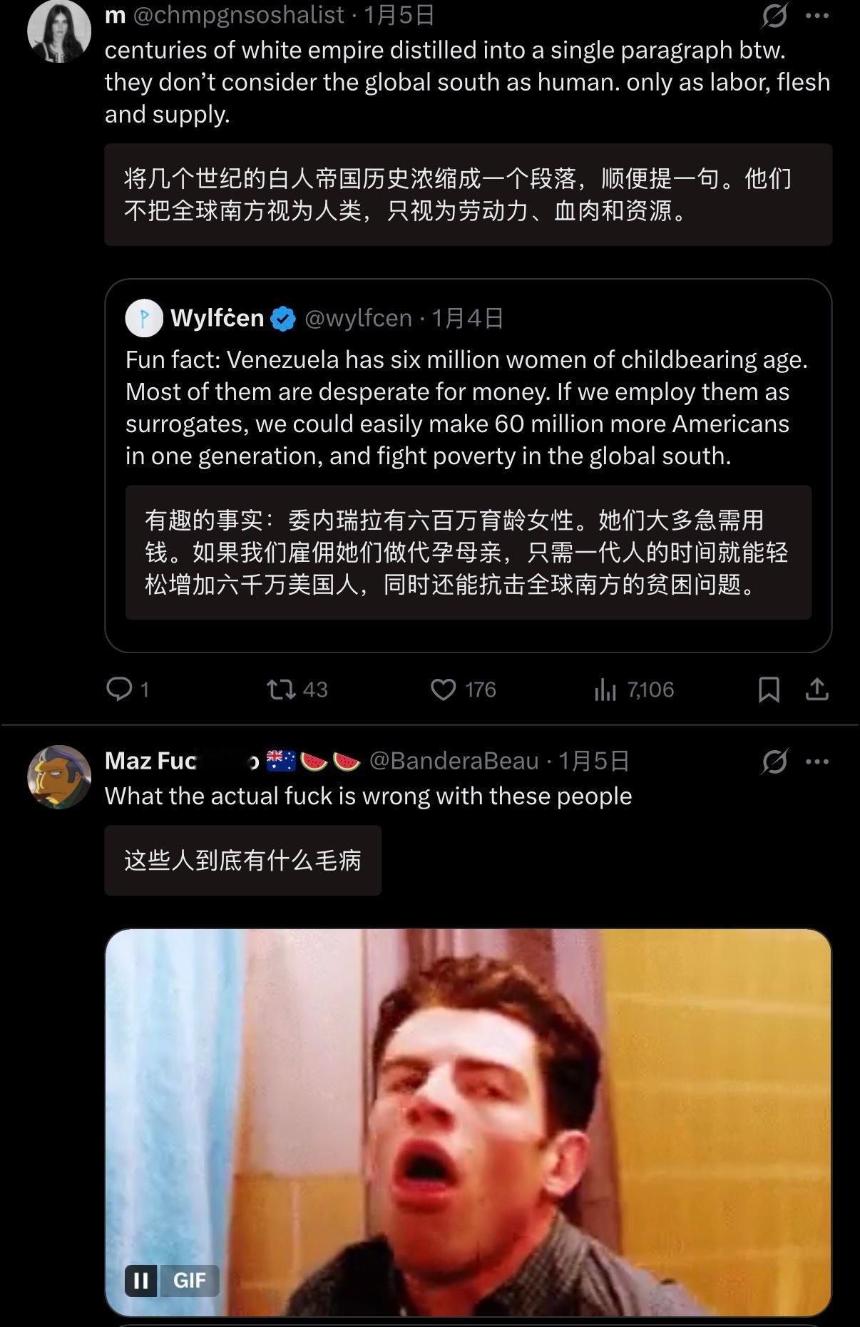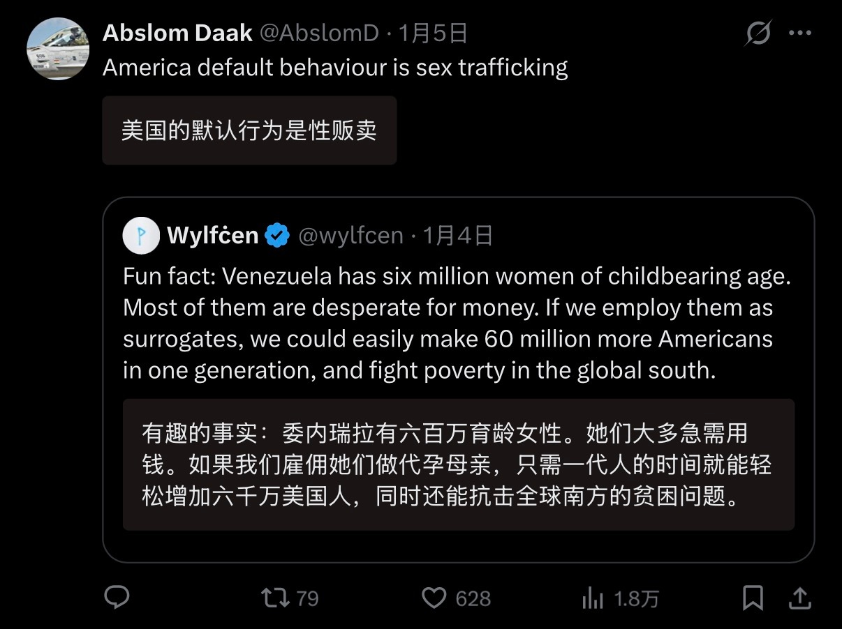 🔻网友jo分享:美国人像讨论牲口一样讨论“600万育龄委内瑞拉女性”,以至于惹恼了全世界网友。裤裆民族主义就是这样的。马杜罗不认罪委内瑞拉临时总统宣誓就任海外新鲜事热点现场