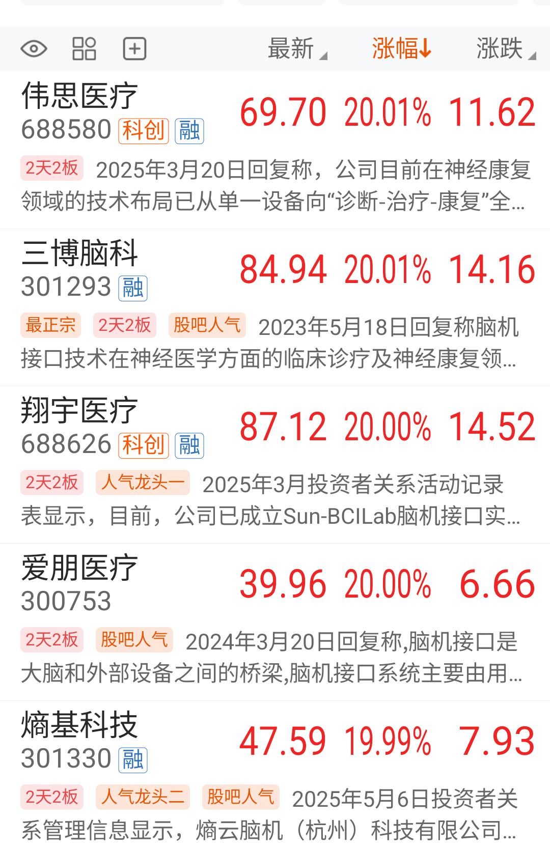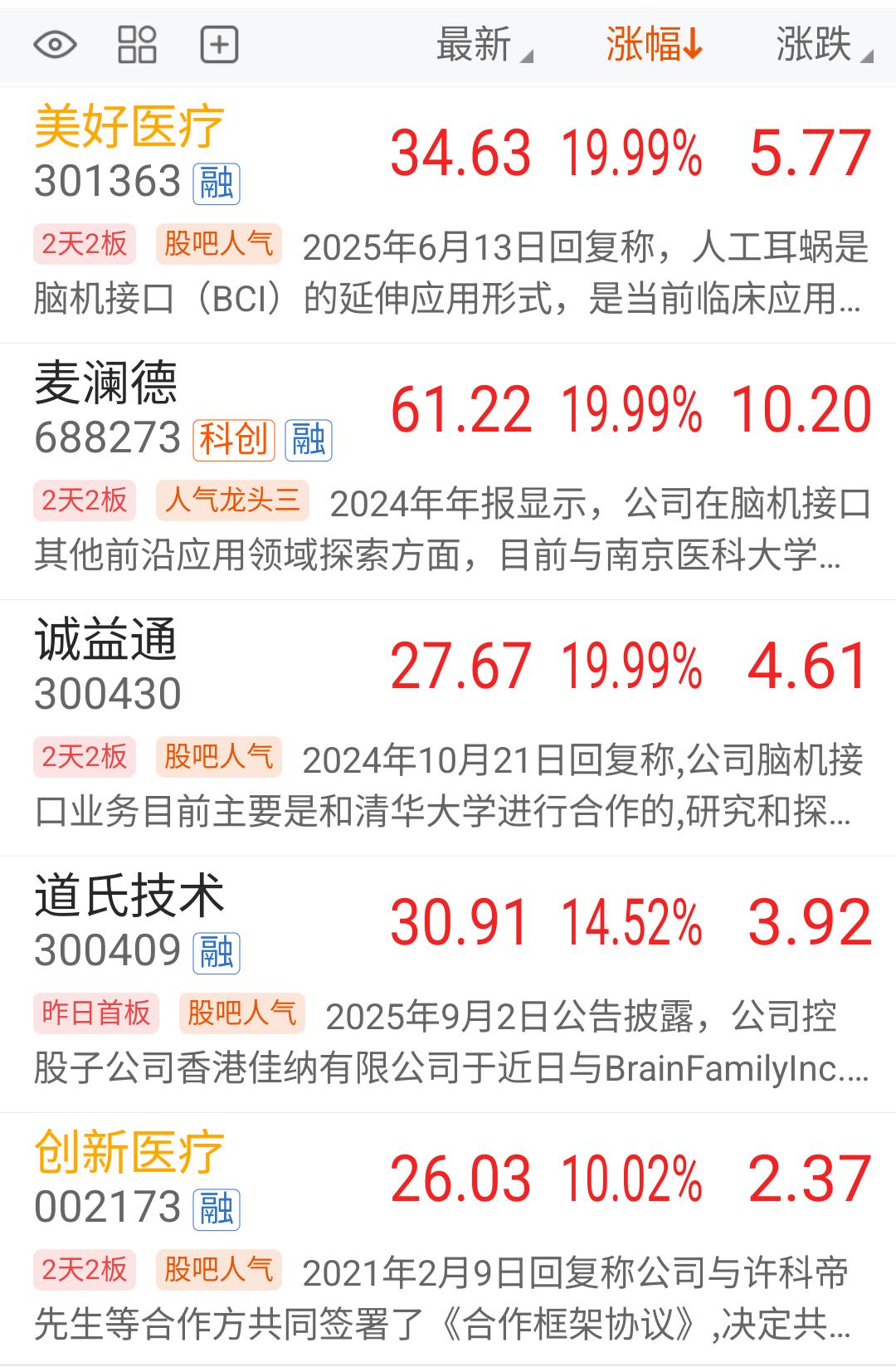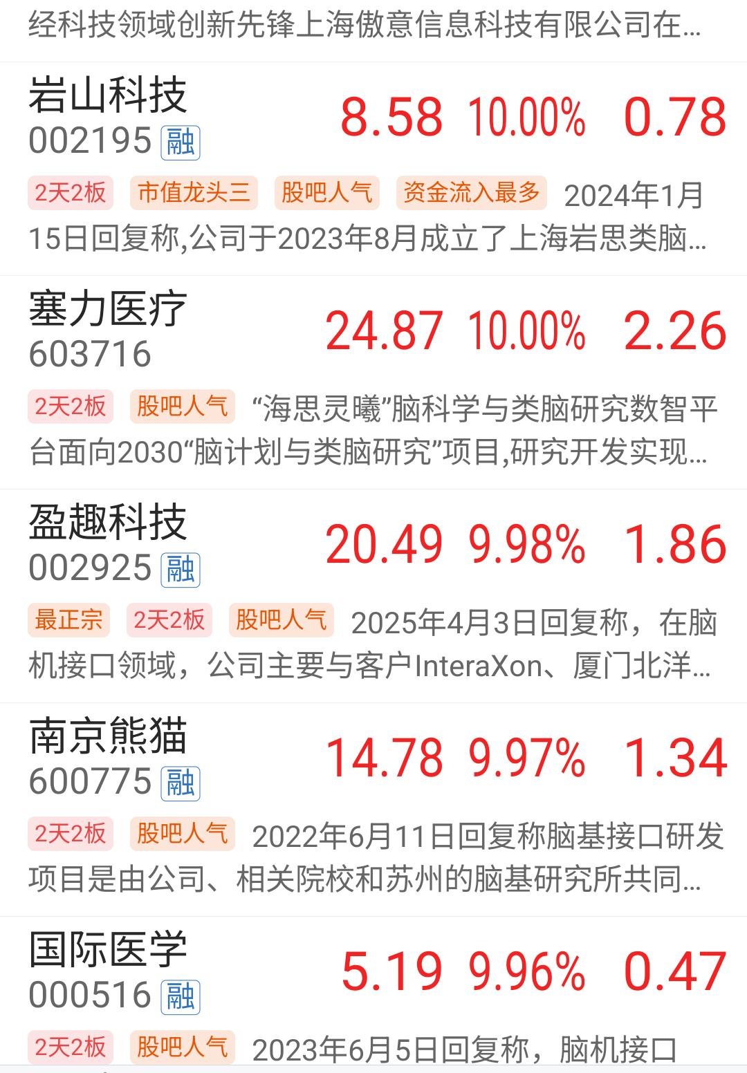 脑机接口(人脑工程)今天还是如预期般强势,继续看好,明天才是决出真龙的时间。 今天还是按计划先进了点人脑工程概念,整个板块集合竞价强的不是一点,一字板的有9家,如三博脑科、美好医疗、岩山科技、创新医疗等等。20CM大幅高开的也不少,如伟思医疗、翔宇医疗、爱鹏医疗等等。 看到这么强势的集合竞价,就毫不犹豫的上了一个300亿大市值的,也是熟悉的老情人之一了,概念正宗、业绩好,位置也不高,另外两个都是一字板了,没机会。给了机会的先拿点先手再说。 谁知高开6个多点,冲到了8个多点就掉头向下了,9点56分之后,一直在分时均线下方运行,虽然到收盘还是红的,但是今天也吃了3个多点的麻辣小面。其实今天是收了个假阴线。 虽然已经吃面了,但这个一点也不担心,随便他折腾,如果整个板块能走出主升浪,怎么能少的了这样的中军呢。 这又让我回想起12月24号进北斗星通的情景了,前一天强势启动,第二天开盘快速下杀,在水下2个多点进去,最终当天还是被套4个点,从第二天略微低开之后,至今就再没有比那天更好的上车机会了,最近已经三连板了。 好饭不怕晚,只要守得住。 明天你还看好脑机接口概念吗? (声明:以上只是个人今天操作记录,绝非荐股,股市有风险,入市需谨慎。)
