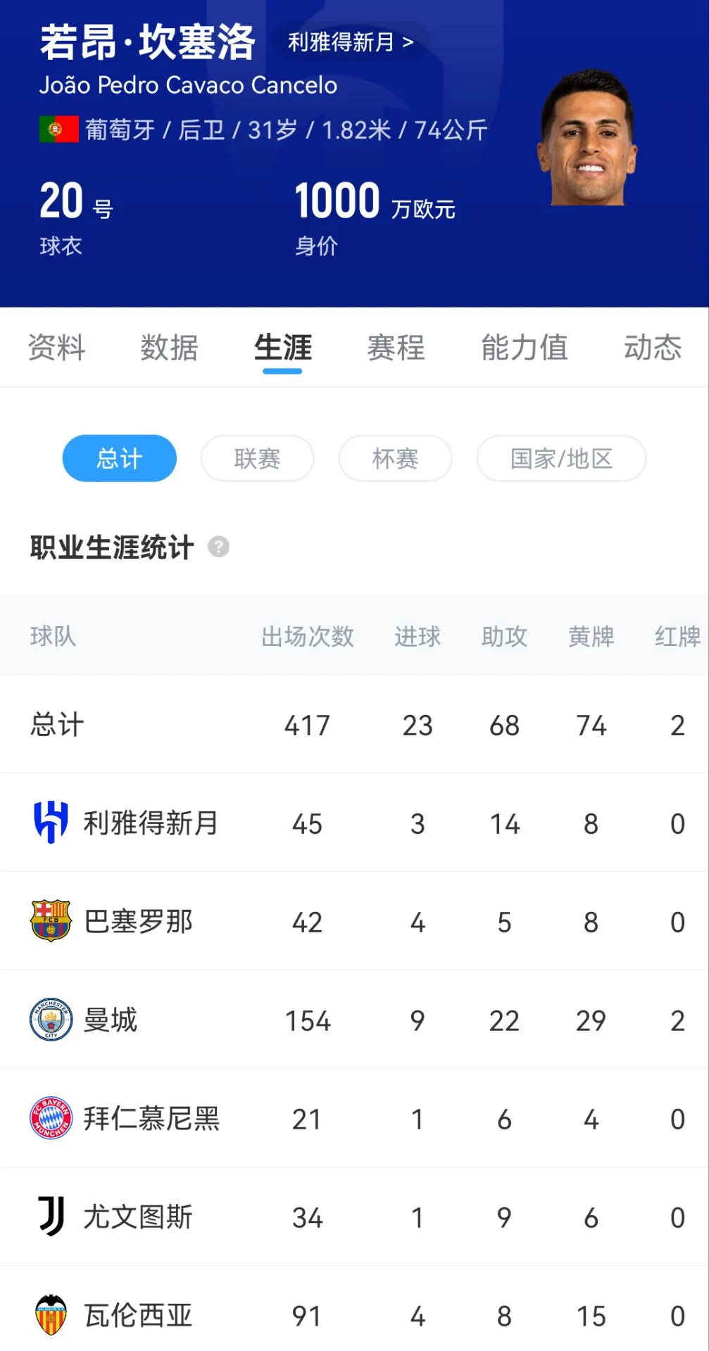 HWG!一声吼呀!从沙特超回归西甲!罗马诺:31岁坎塞洛将租借回归巴萨!巴萨支付400万欧租借费。31岁的坎塞洛2024年夏窗以2500万欧元价格从曼城加盟利雅得新月,此前他曾于2023年租借效力过巴萨一年(42场4球5助)。