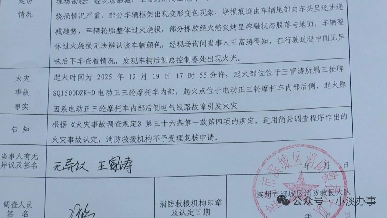 电动三轮车行驶过程中突然起火,厂家不认可消防认定结果! 山东滨州王先生2025年12月19日晚骑行新买的三枪牌电动三轮车时,闻到焦糊味下车后,车辆突发爆燃,被消防员扑灭后只剩空架子。这辆车是他11月16日花6600元购入,用于家中老人接送孩子,万幸爆燃未发生在接送途中。 滨州市滨城区消防救援大队认定,起火原因是车辆内部后侧电气线路故障。王先生找到购车的立马电动车专卖店索赔,因质疑该品牌安全性,他拒绝换新车的提议,坚持全额退款,双方产生分歧。 特派员介入后得知,该车生产厂家已向经销商支付8000元赔偿款,却未给到王先生。店主后续提出赔同款车或6000元现金,均被王先生拒绝。厂家虽对消防认定存疑,但承诺催促赔付,经销商起初以担心节目报道拒转款项。经多轮协商,王先生最终拿到6600元全额购车款,纠纷得以解决。 来源 综合小溪办事