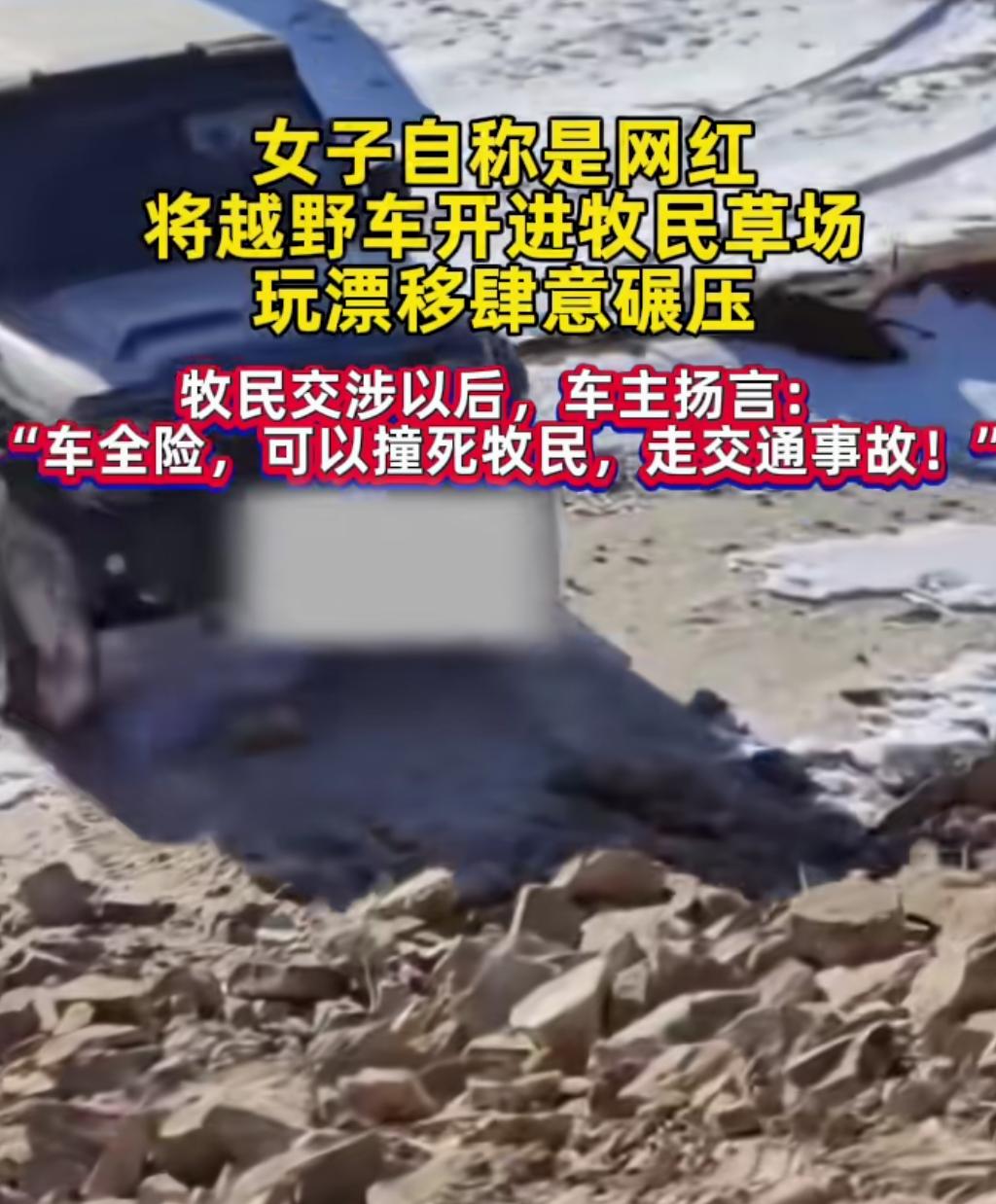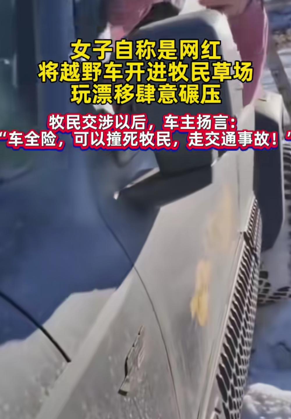 女子开车进牧民草场肆意碾压 当事人账号被扒了个底朝天 自始自终不承认自己有错 事发1月4日,内蒙古赤峰,女子驾驶坦克越野车,开进牧民草场肆意碾压,草场围栏都给撞坏了。 牧民上前交涉阻止以后,女车主不但说自己是网红要报警,还嚣张扬言:“车子有全险,可以撞死牧民。” 女的社媒账号被扒,发现其来自浙江宁波某一贸易公司,粉丝也就1千多人,并且在账号评论区和网友互怼,狡辩说牧民掐头去尾拼接的视频。 她觉得草场有雪覆盖,车碾压不会有什么大事,可据当地人说,赤峰冬天的草场受到重力碾压会影响来年青草发芽,草场都是有主儿的承包地,那是牧民的院子也是饭碗。 另外这女的说车全险,撞死人可以走保险,牧民录音视频报警,单就这一点,她就构成了犯罪。 现在的“网红”二字,都给整成了贬义词,无知者无畏,知道事情的严重性之后,女车主准备删除账号跑路。 女子开车进牧民草场肆意碾压 牧区事故