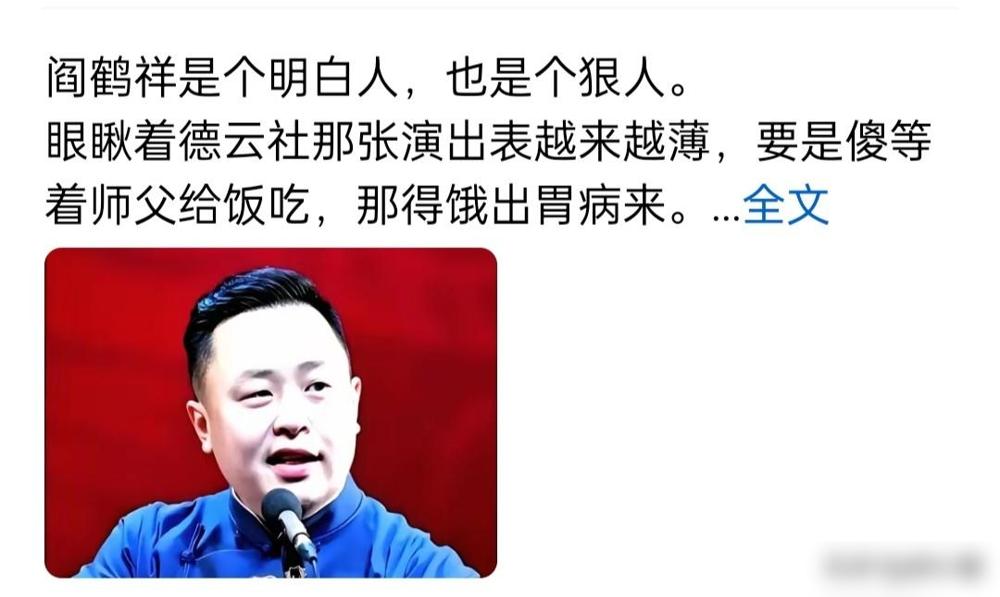 全网都在逼张鹤伦和阎鹤祥退出的德云社。网友替张鹤伦算账,一年100多场的相声专场,给德云社挣了多少钱,德云社抽的太多了,还不如自己和郎鹤炎出来单干,要不对比一下,曹云金和金菲陈曦的相声专场呢,离了德云社这块招牌,谁能卖千元的票价,谁能在体育馆开相声专场。 最近这风向确实有点怪,不少人都在那儿认真复盘,觉得张鹤伦和阎鹤祥在现在的体系下受了委屈。 其实我更在意的是那个“溢价”问题,如果单独拎出来,个人单干想在体育馆把门票卖到上千块,这难度恐怕不只是翻倍那么简单。 拿张鹤伦来说,一年跑一百多场专场确实辛苦,但离开了德云社这个大生态位,很多演出机会和商业排期可能根本就不会存在。 还有人替阎鹤祥叫苦,觉得郭麒麟不回来他就没收入,但我看他现在也没闲着。 不管是给热门剧《庆余年》配旁白,还是去大热的脱口秀综艺里露脸,这些跨界的门票,说到底还是有平台背书在里面。 我看现在的争议其实是把“分成高低”和“赚钱总额”给搞混了,小作坊可能分得比例高,但大平台的盘子大,天花板完全不在一个层面上。 想想以前一个是在路边干烧烤的,一个是在移动公司当程序员的,能走到今天这一步,这种互相成就的关系远比表面上看到的要深。 现在的舆论感觉不是在帮忙,反而更像是在催着人家散伙,但这种“为你好”的分析往往忽略了成年人最现实的利益权衡。 说实话,他俩现在能拿到的影视和综艺资源,很多就是基于“德云社大将”这个身份带来的标签溢价,单飞后的路未必有大家想得那么平坦。