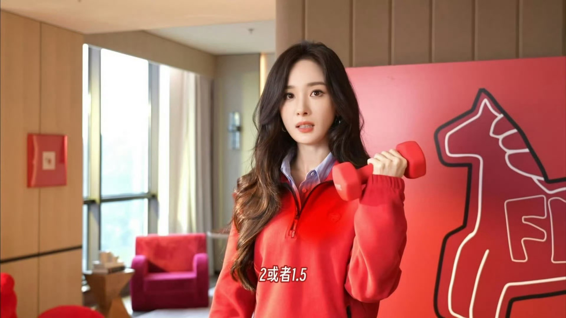 杨幂就这样连拍广告的时候,都不忘拿哑铃和水瓶不停练练练