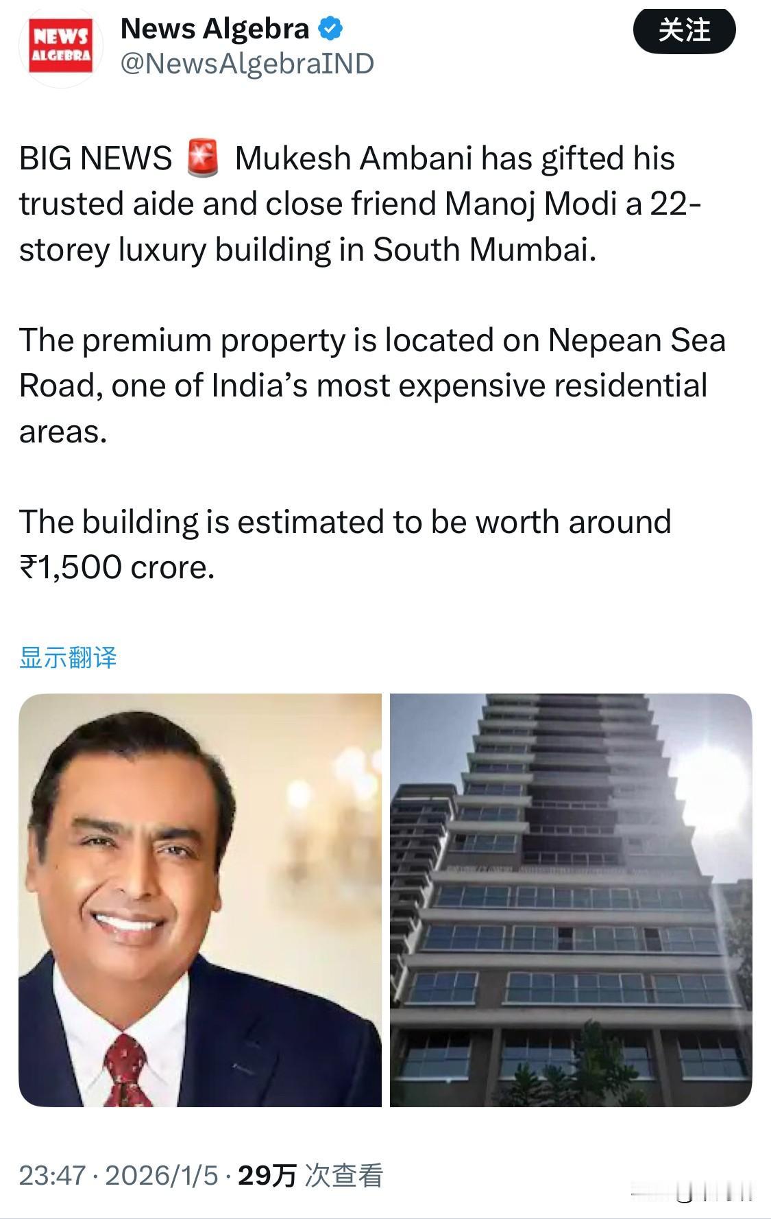 重大新闻:印度首富,印度信实工业集团(Reliance Industries)的主席穆克什·安巴尼将位于孟买南部的一栋 22 层豪华大楼赠予了他信任的助手和密友马诺杰·莫迪。 这处高档房产位于尼皮恩海路,这是印度最昂贵的住宅区之一。 据估计,该建筑价值约₹ 1500亿卢比。 马诺杰·莫迪(Manoj Modi)被公认为印度首富穆克什·安巴尼(Mukesh Ambani)的“右臂”,是信实工业集团(Reliance Industries)最具影响力的幕后推手之一。 尽管马诺杰·莫迪行事极其低调,不在母公司担任显赫的高管头衔,但他目前担任信实零售(Reliance Retail)和信实 Jio(Reliance Jio)的董事。 安巴尼的亲信: 他是穆克什·安巴尼的大学同学(均毕业于孟买大学化学技术学院),两人自 20 世纪 80 年代起便紧密合作,至今已超过 40 年。 关键商业贡献 重大项目推动者: 他曾主导并执行了信实工业历史上多个里程碑式项目,包括贾姆纳格尔(Jamnagar)炼油厂、石化工厂建设,以及信实从传统能源向电信和零售行业的跨越式转型。 顶级交易员: 他以高超的谈判技巧著称,曾是 2020 年 Facebook(现 Meta)向 Jio 投资 57 亿美元交易背后的关键人物。 代际导师: 目前他也在指导安巴尼的子女(阿卡什、伊莎和阿南特),帮助他们接手家族企业的核心板块。 巨额馈赠 1500亿卢比豪宅: 为感谢其数十年的忠诚与贡献,安巴尼于 2022-2023 年间赠予他一栋位于孟买黄金地段(Nepean Sea Road)的 22 层超豪华大楼(名为“Vrindavan”),价值估约 1500亿卢比(约 16亿美元)。 马诺杰·莫迪几乎从不在公众场合露面,也不使用社交媒体,在公司内部常被称为“MM”。 非总理亲属: 尽管他姓莫迪,但他与印度总理纳伦德拉·莫迪没有任何亲戚关系。