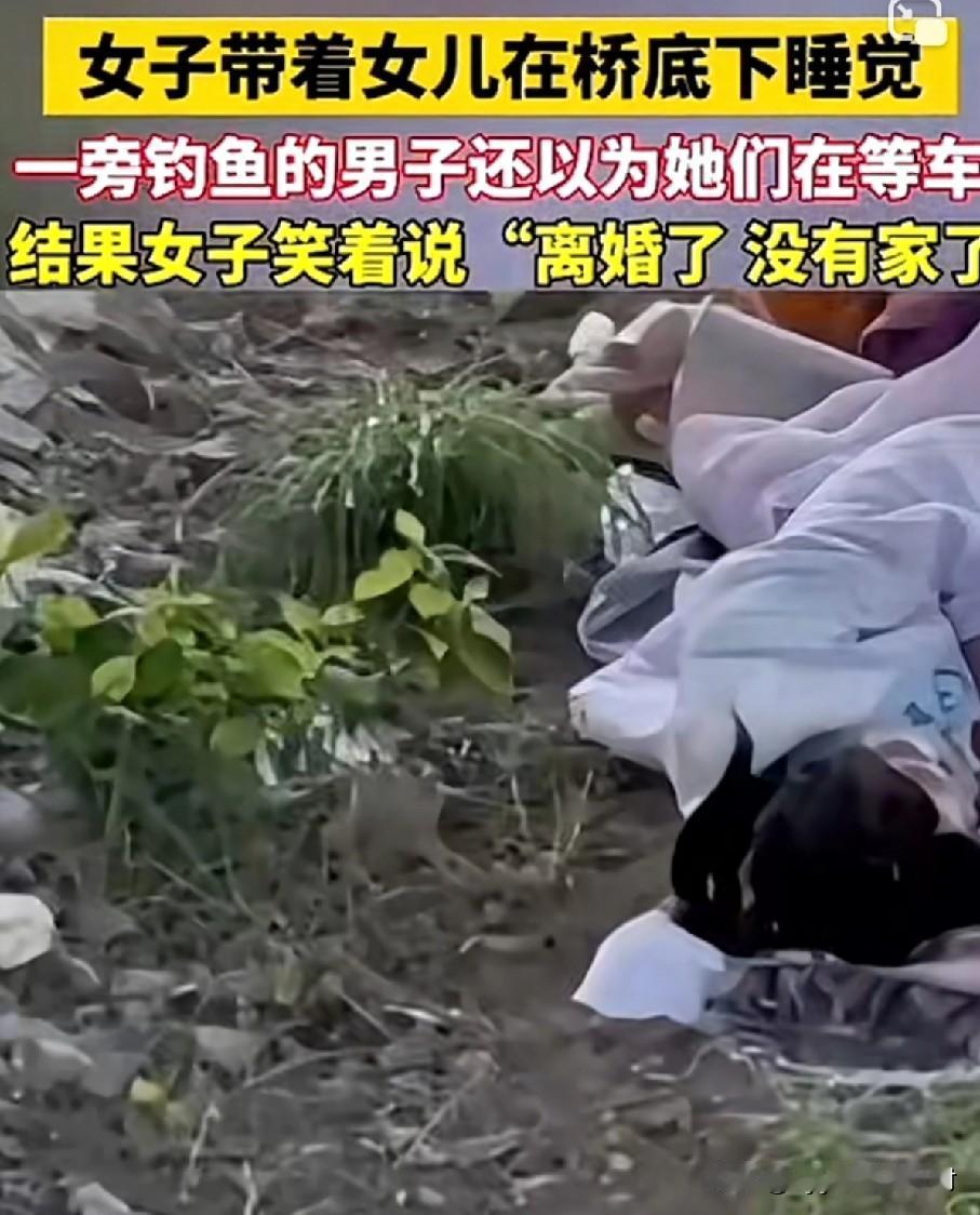 太心酸了!一女子离婚后,无处落脚!竟带着女儿,在桥底下睡觉! 这是谁家的宝贝女儿,又是谁处心积虑娶进门的前妻啊!一旁钓鱼的男子,开始还以为她们在等车!结果,女子却笑着说“我离婚了,没有家了!” 她表面的云淡风轻,却掩饰不住内心的波涛汹涌!哪个母亲会希望,孩子跟着自己风餐露宿呢!好多网友,在评论区纷纷留言,要帮助这对可怜的母子! 唉!连陌生人,都愿意伸出援助之手!女子曾经的婆家人,怎么就舍得她受苦呢?家家都有本难念的经,人人都有伤心的事啊! 所以友友们,你觉得女孩子在婚前给自己买套房子,有必要吗?父母该不该,给自己的女儿在婚前准备一套房?