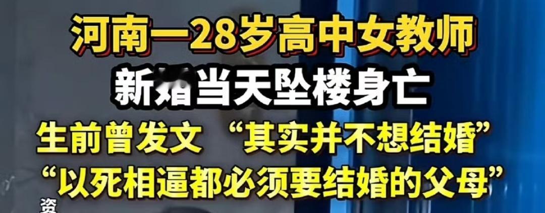 当“结婚”被奉为人生必答题,年轻人又该去哪里寻找“不结婚也能好好活”的底气? 女教师结婚当日坠楼背后,看到一纸婚书,压垮了她的整个人生[流泪][流泪]!28岁的县城女教师,终究没能熬过七年催婚的磋磨,婚礼当天的纵身一跃,是她对这场人生绑架最绝望的反抗。 她曾是捧着大学文凭的姑娘,本该有自己的人生选择,却被故土的人情枷锁牢牢困住。在小县城的人情网里,“不结婚”就是原罪,父母的念叨、邻里的指点,像一张密不透风的网,逼得她不得不低头妥协。 我听别人说过,女孩子要去大城市,去包容度高的地方。大城市里,没人会揪着你的婚育状态指手画脚,大家忙着过自己的人生,你尽可以按自己的节奏活。可小地方不一样,狭隘的偏见裹着“为你好”的外衣,明晃晃的恶意扑面而来,容不下一个女孩对“不婚”的选择权。 这份沉甸甸的悲剧,看的人心里满是堵得慌的疼。老一辈总想着让子女按自己的模板活,却忘了,子女不是复刻品,是活生生的人,也有自己的山海要奔赴。 困在小县城的女孩,又该如何挣脱“按部就班”的人生模板?当老一辈的执念,撞上年轻人的自我觉醒,这场拉锯战里,谁该为生命的凋零负责?为什么总是被催婚呢 结婚意义 对结婚的答案 被逼结婚的感受
