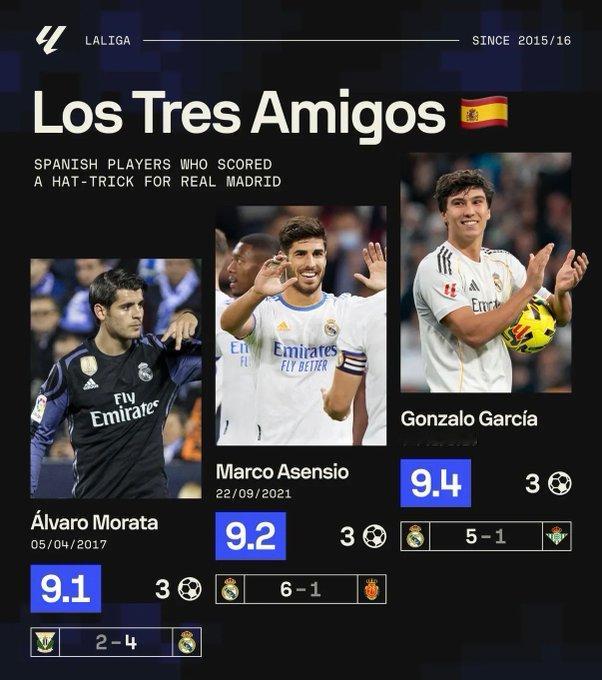 过去十年中,共有三名西班牙球员为皇家马德里上演过帽子戏法。 皇马